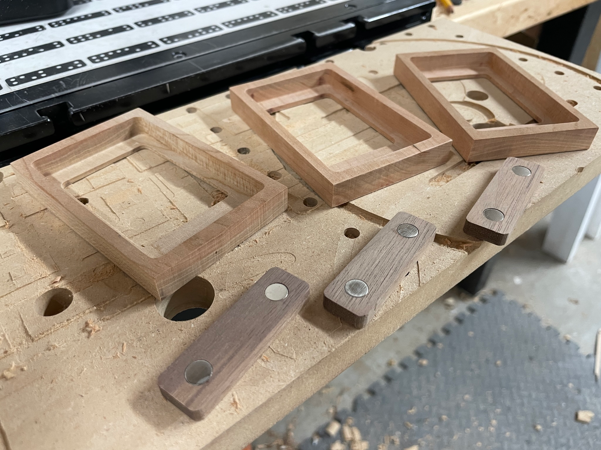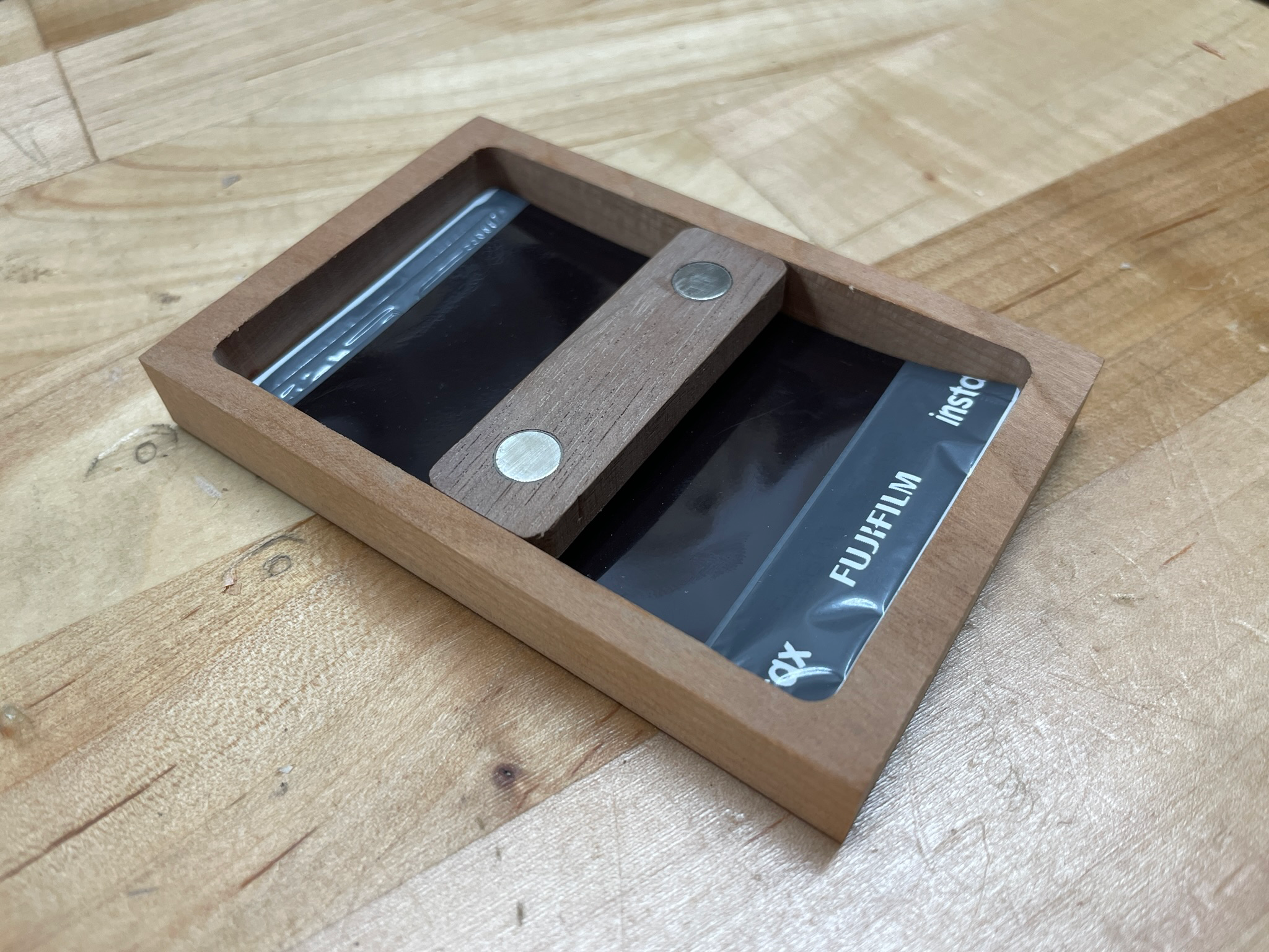 (Currently project is setup for .25 inch bit for speed. You might need to chisel out the inside corners) Cut Magnet Piece First (.25 inch thick material) -holes are setup for .315 inch diamter magnets (resize hole if different magnet size) -cut holes for magnets a bit deeper than the height of them so the magnets don't drag across your fridge (in my case they were .108in thick and I cut them to .11 inch deep) -cut outside to full depth and 0 offset We do this the magnet first so you can make sure test fit is good with the frame side later. Cut Frame (.5 inch thick material) -cut the innermost shape to full depth to start -pocket the inner part to 3/8 inch thick -cut the inside cut on that same shape (test fit now with your magnet piece to make sure it's tight fit, open up offset if necessary) -cut outside shaper to full depth Glue magnets in with wood (epoxy or CA glue) Glue the magnet piece into the frame flush in the middle on the backside Sand and finsih! Comments? Did you make one? Let me know! https://community.shapertools.com/t/magnetic-instax-mini-frame/8331 Made a little video showing my prototyping process as well: https://www.instagram.com/tv/CWzBu1FDTd5