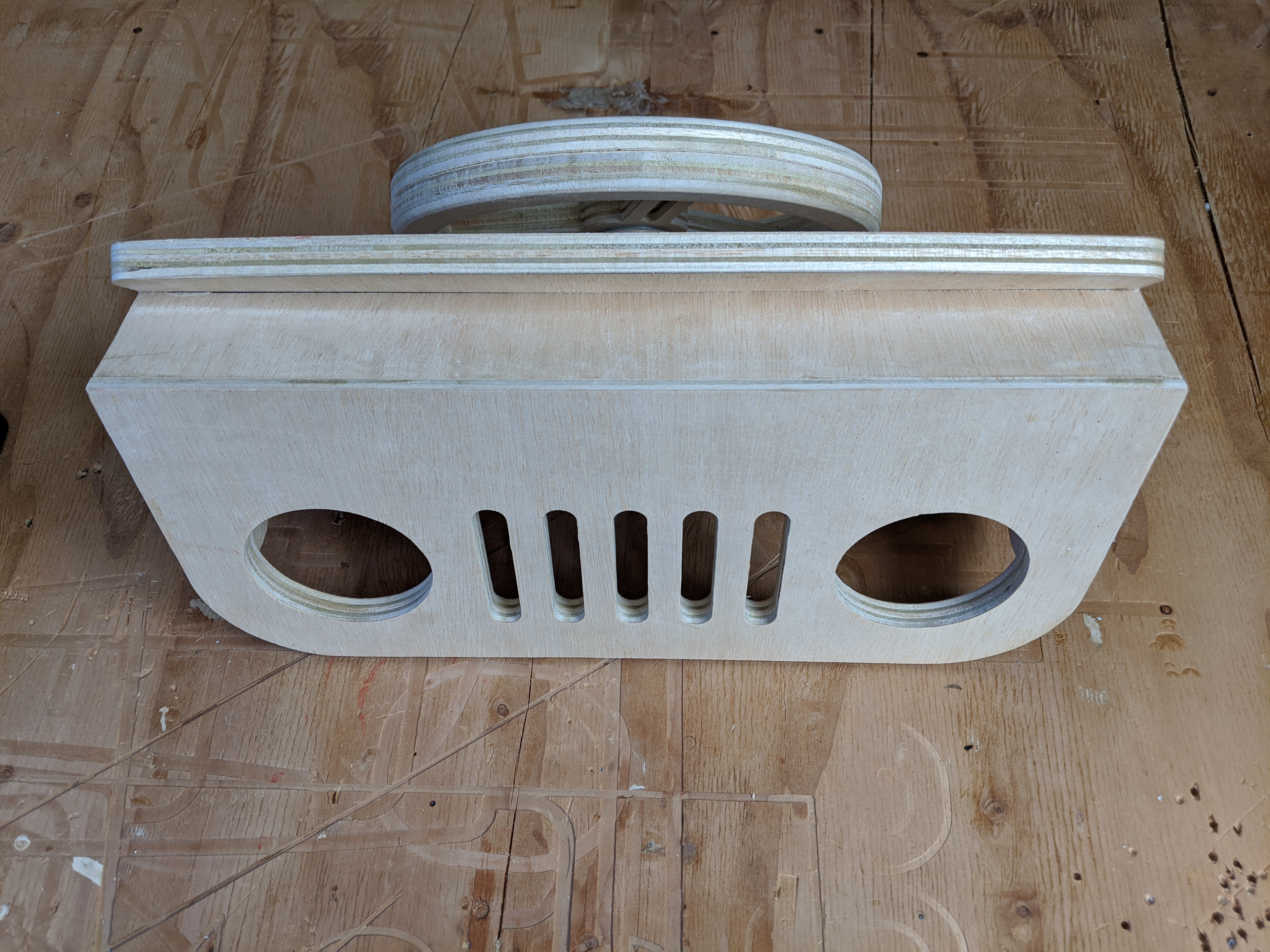 Mount ply good side down on a spoil board. Cut all rabbets / details to 1/4" deep. Otherwise everything is through cuts. Cut the left and right sides, and chisel the highlighted corner square ( you will see it when you are cutting the svg file ) Cut 2 X standoffs Cut 2 X steering rims ( the three little inside cuts need to be pocketed out as well ) Sand everything, Then flip both steering rims so the little pockets face down, with a trim router and a 1/4" radius roundover following bit, Round over the inside and outside of the steering wheel and sand so its nice and smooth. Flip the dash, so the good side ( the side without the assembly details ) is facing up, customise it by visually aligning the dash details file and engraving this dash or a dash of your own design. Assemble the steering wheel components, and glue them together and clamp for 24 hrs. Assemble, glue and clamp the remainder. the colored images should communicate how to the parts are configured. Use the 6mm screw to help align the two standoffs on the top surface of the dash while the glue sets. Painters tape / brad nails or clamps can be used to hold everything in place while the glue cures. Once the glue drys, sand and finish everything. Install the screw from the top, with a washer between the standoff and the wheel, and another on the bottom side between the dash and the locknut. Spin the wheel to ensure it moves freely. Spin it again, just because. enjoy