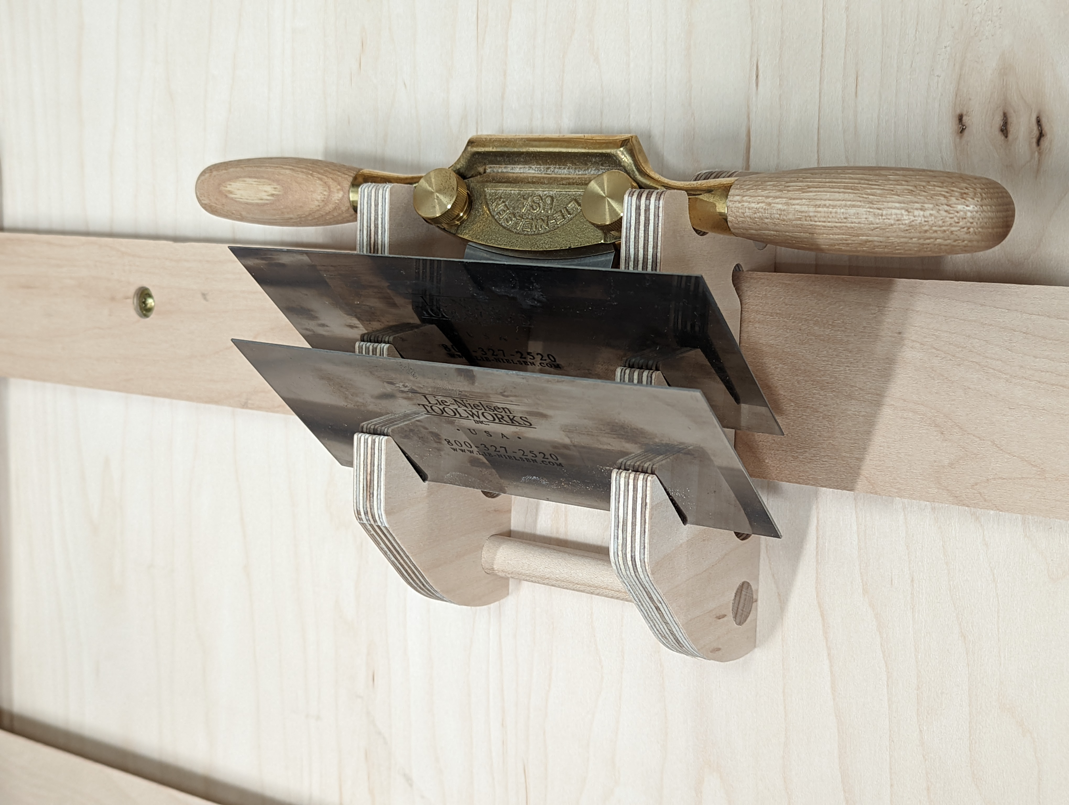 designed to house: scrapers: https://www.lie-nielsen.com/products/handscrapers-hand-scraper-set-?path=handscrapers&node=4181 spokeshave: https://www.lie-nielsen.com/products/1-sp-boggs-f-boggs-spokeshaves?path=spokeshaves&node=4091 If you want the dowels to be inserted blind rather than the whole way though Place the file , and copy / mirror it for the opposing side. if you want to cut the dowels through ( as pictured ) just place the file twice. first cut the two narrow slots using the 1/8" cutter then switch to the 1/4" cutter and cut your dowel holes test fit dowels, ( they are seldom the exact dimension they claim to be. ) confirm dowel lengths, glue and fit. magic