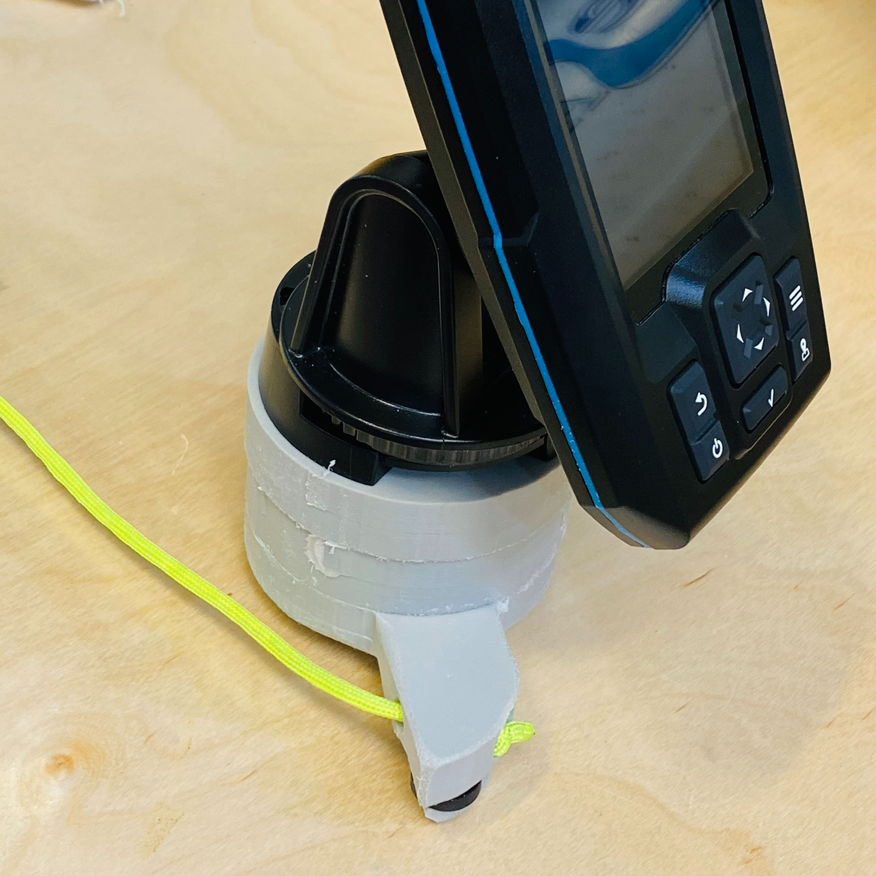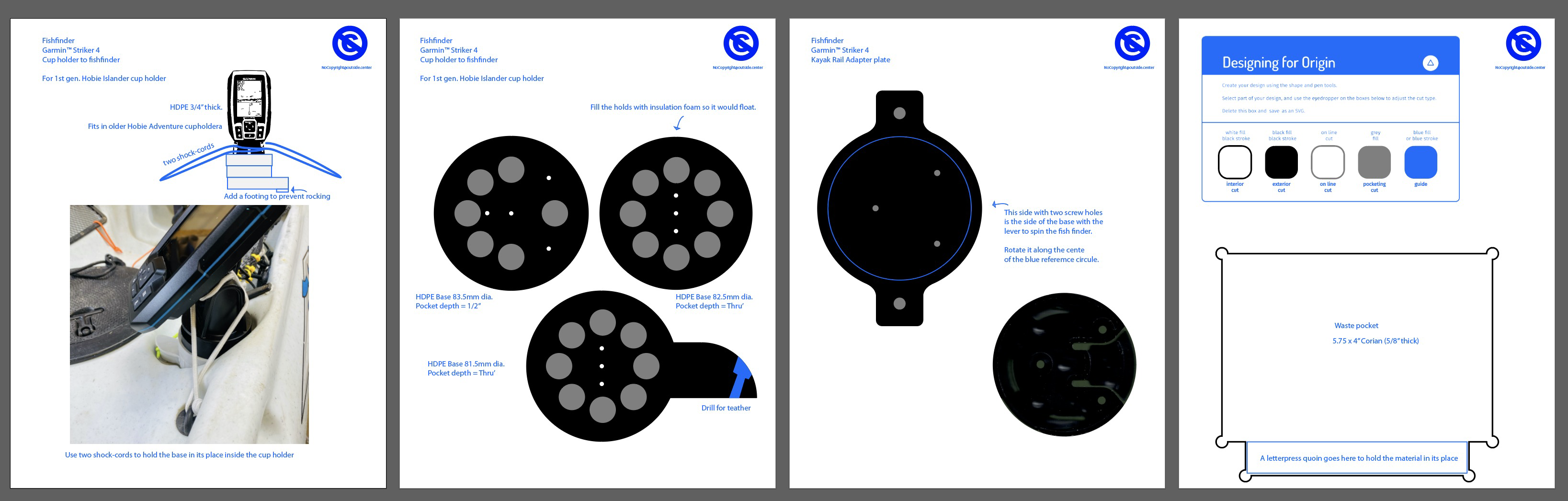 In the .svg file you will fine two projects. One for a cup holder to Garmin Striker 4 adapter for Hobie Islander (original version - but may be applicable to other cup holders). The other is the adapter for equipment rail to the same Fish finder. You will need a pair of "Rail/Track Screws & Track Nuts Hardware" NoCopyright@outside.center