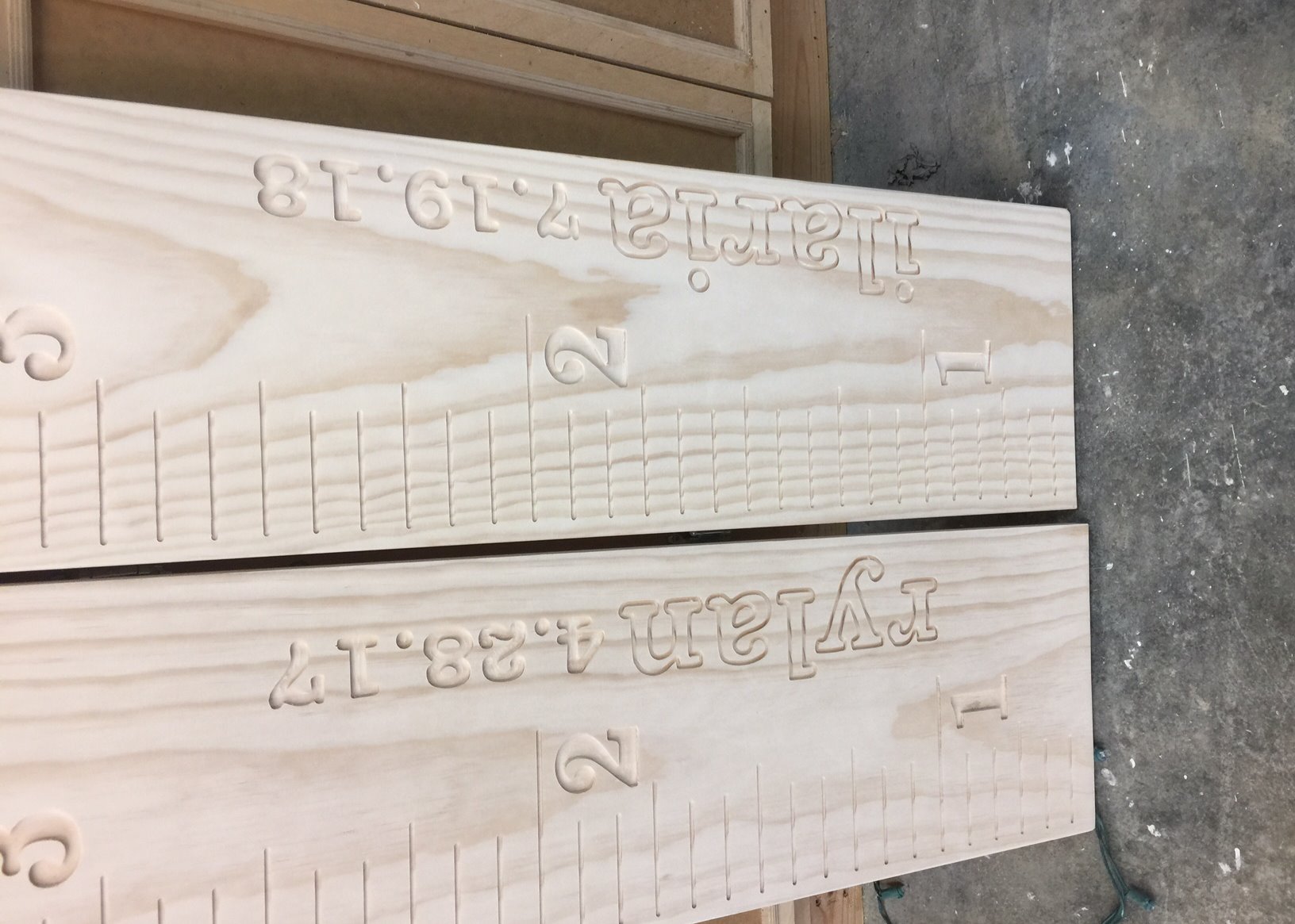 Created this growth chart svg file using a dxf file, Fusion 360, and Inkscape. For the names and birthdates I used MS Word and Inkscape to create the svg files and scaled them to the size I liked in the router. The inch lines and lettering were all created using a 1/8" bit.
