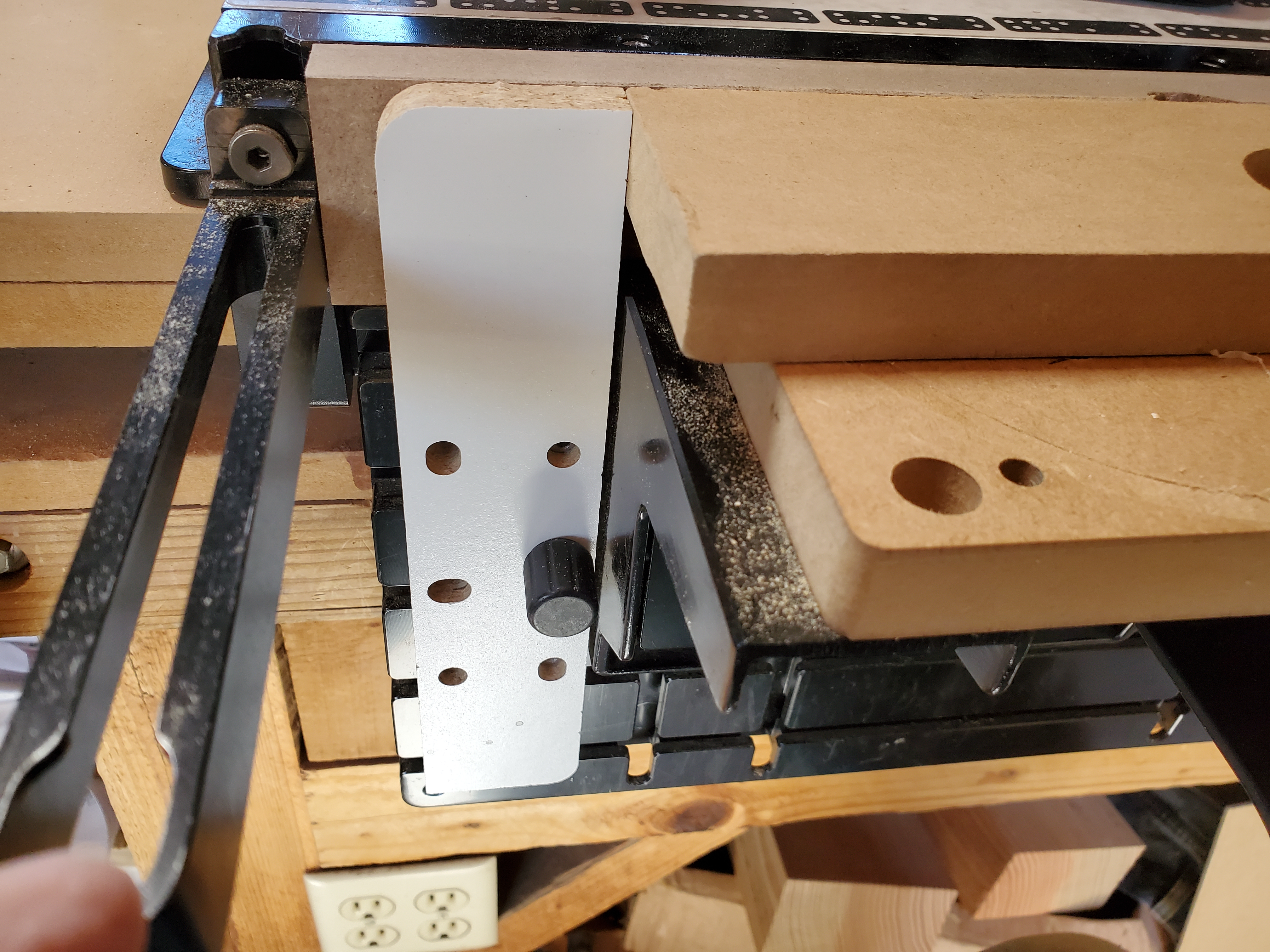 The stop can be turned upside down (end for end) to change its height such that it will work with the W/S clamping face in either location. It can be turned over (face for face) to move it to the right end of the W/S clamping face. Photos show it on the left end with the W/S clamping face in the upper and lower positions. If the stop is in the way during cutting, one can remove it after the blank is anchored in place, and replace it with accuracy after cutting is completed.