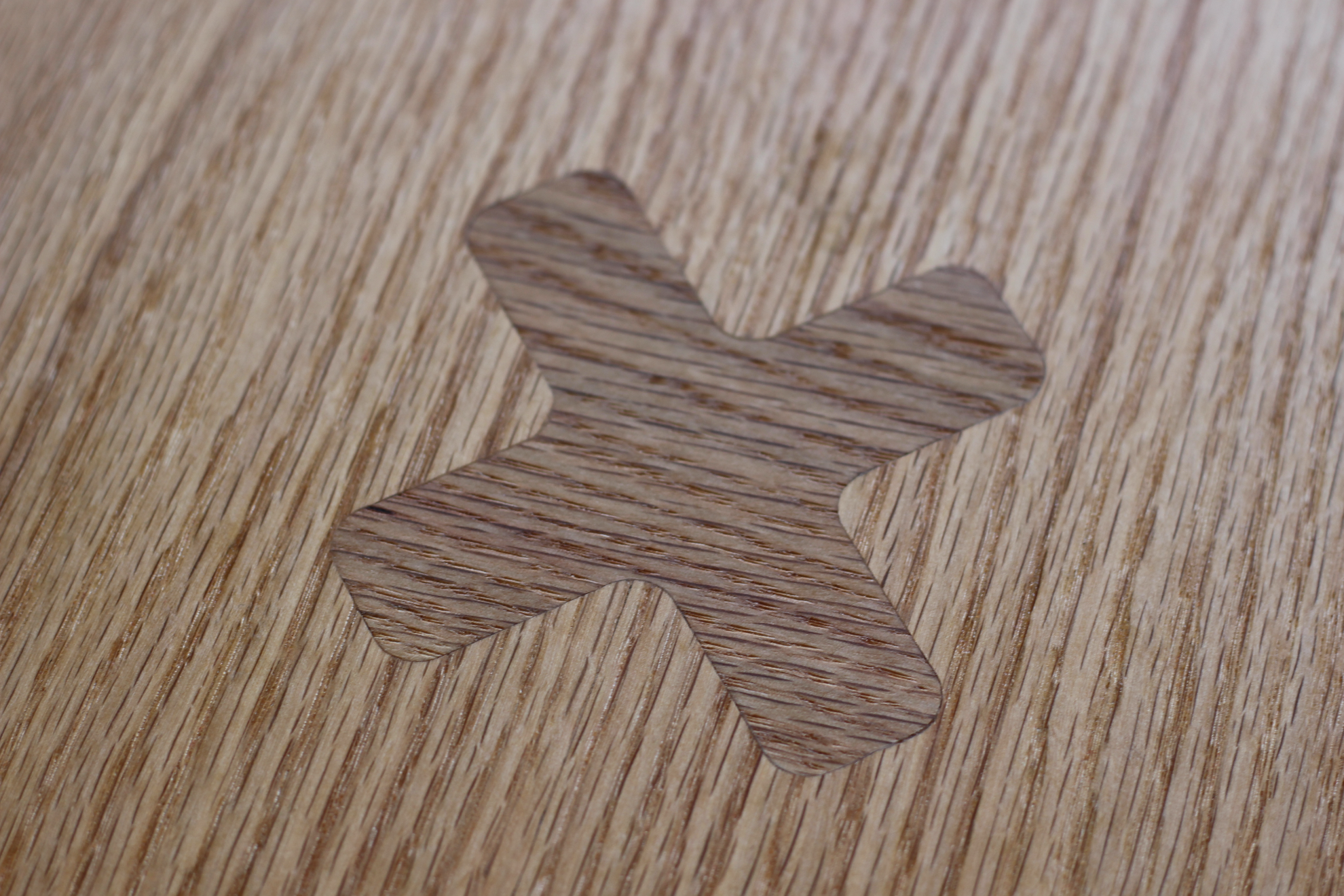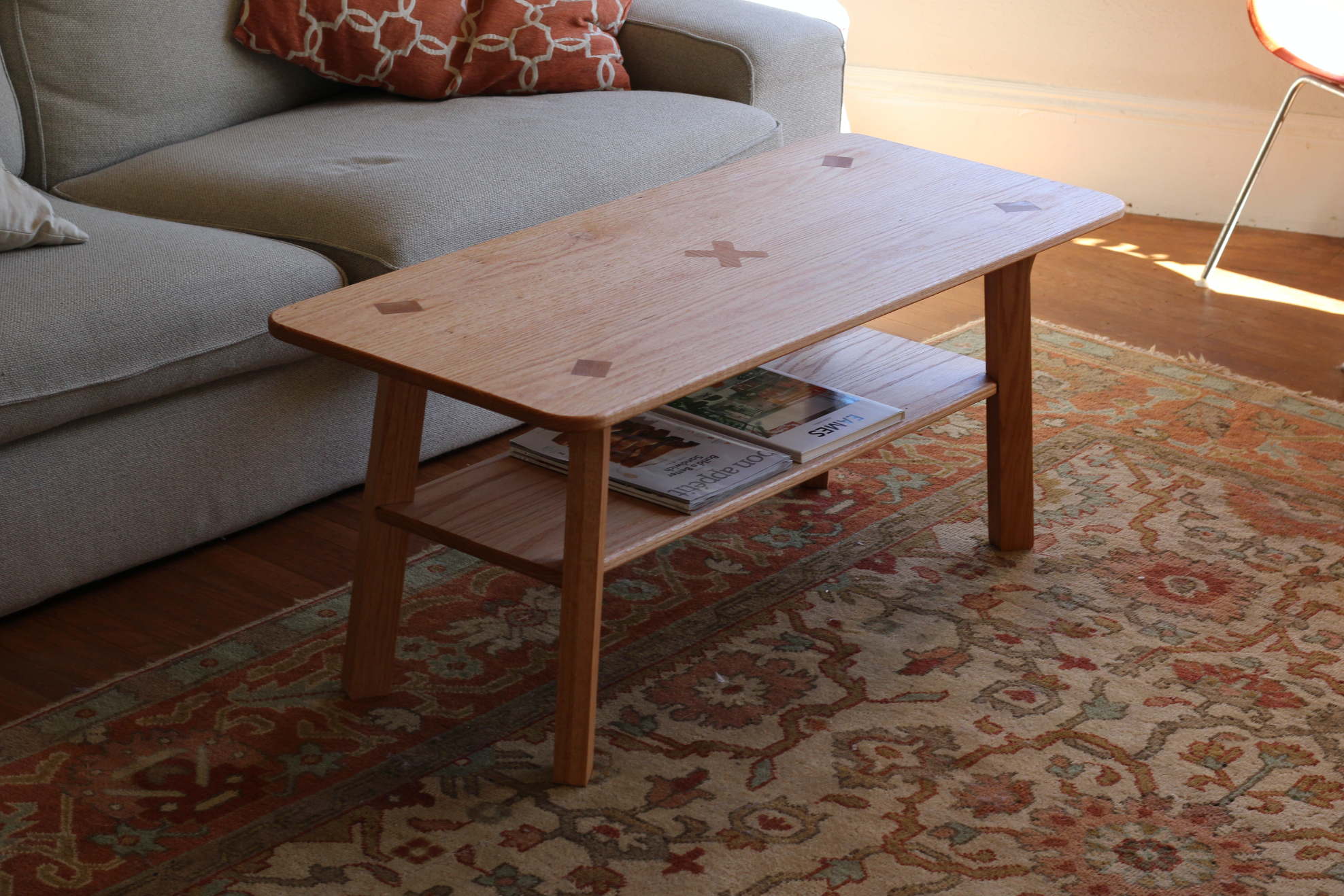 Simple mortise and tenon oak coffee table with a cross inlay.