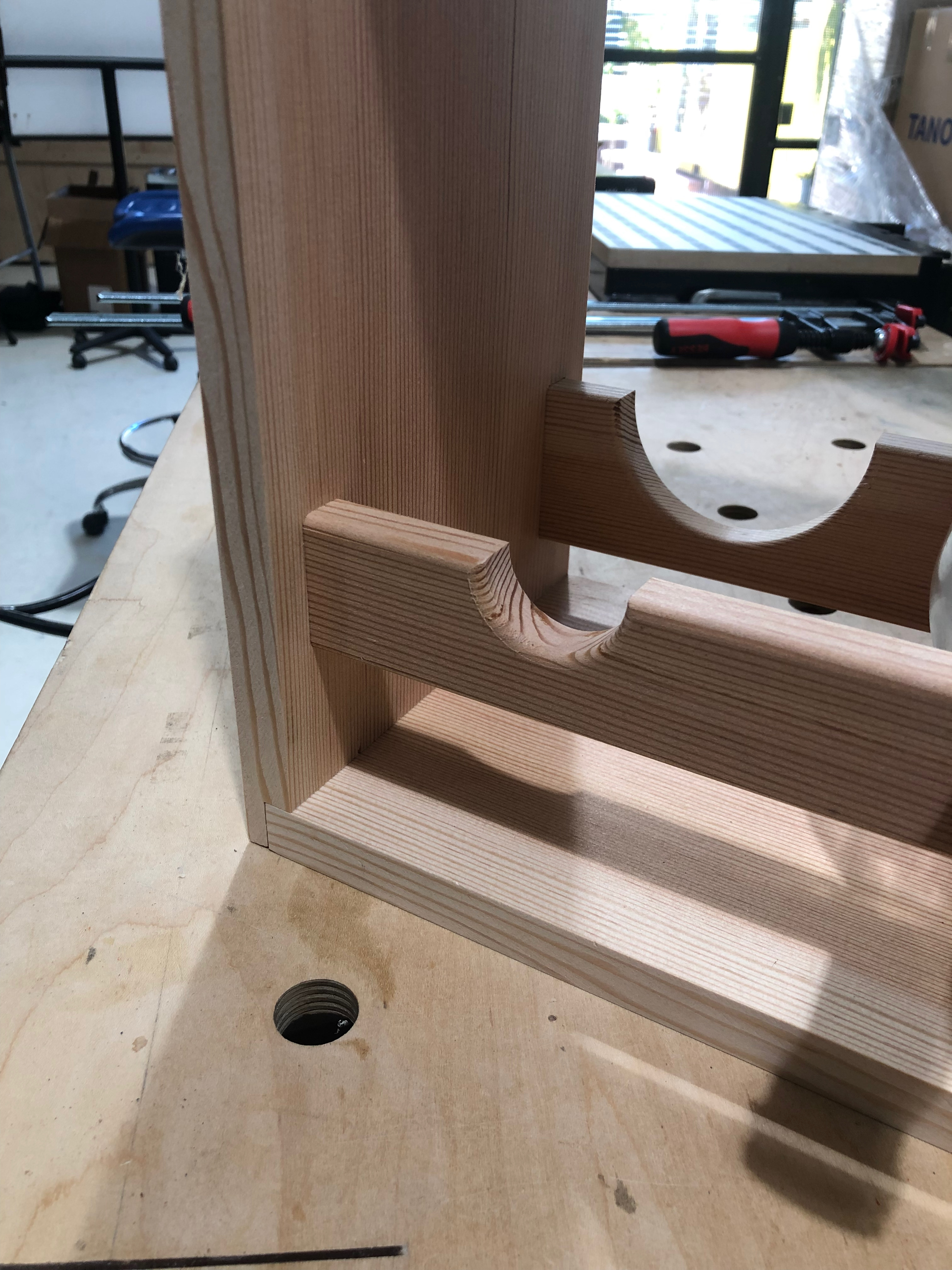 NOTE: There are two sets of files in the project. One is for the 7" deep rack that I made in the video where the bottles stick out the front and back a bit. The others are for a 10" deep version where only a little bit of the neck of the bottle with stick out the front. You could put a back on this version if you'd like. These files are set up for the use of the Freud Dovetail bit with a 3/8" base and a 9 degree angle. Item 22-102 Step 1: -Setup on the workstation shelf and cut the slots for the glasses in one of the shelves. -Use the shelf again to cut the half circles for the bottle rack. -Use the 1/8" roundover bit on all of the rack parts so that it fits into the mortise later on. -Also round over one edge of the Back material. Step 2: -Set up one of the shelves into workstation to cut the dovetail -Place the dovetail file using the custom anchor point at x=0" y=0" -NOTE: only plunge and retract in the safe zones to the far left and far right of the file -Depth = 0.325" -Bit Diameter = 0.27" -First pass offset = 0.01" -Second = 0" -Repeat on both shelves Step 3: -Setup with a ShaperTape board the same thickness as your material. -Make a grid and place both the left and right files using the custom anchor point. -There are many decorative cutouts that you can choose whether or not to use. -Cut the rabbet joints: -Depth = 0.325" -Cut the mortises for the bottle rack -Depth = 0.34" -For the sliding dovetail rails, it helps to clear out as much material as you can with your stock 1/4" cutter first. -Depth = 0.325" -Offset = 0.02" -Use the dovetail bit and sneak up on the perfect fit. Step 4: -Glue and assemble -After the glue dries, I recommend adding some dowel reinforcement to the rabbet joints for added strength. -Sand, finish and enjoy!