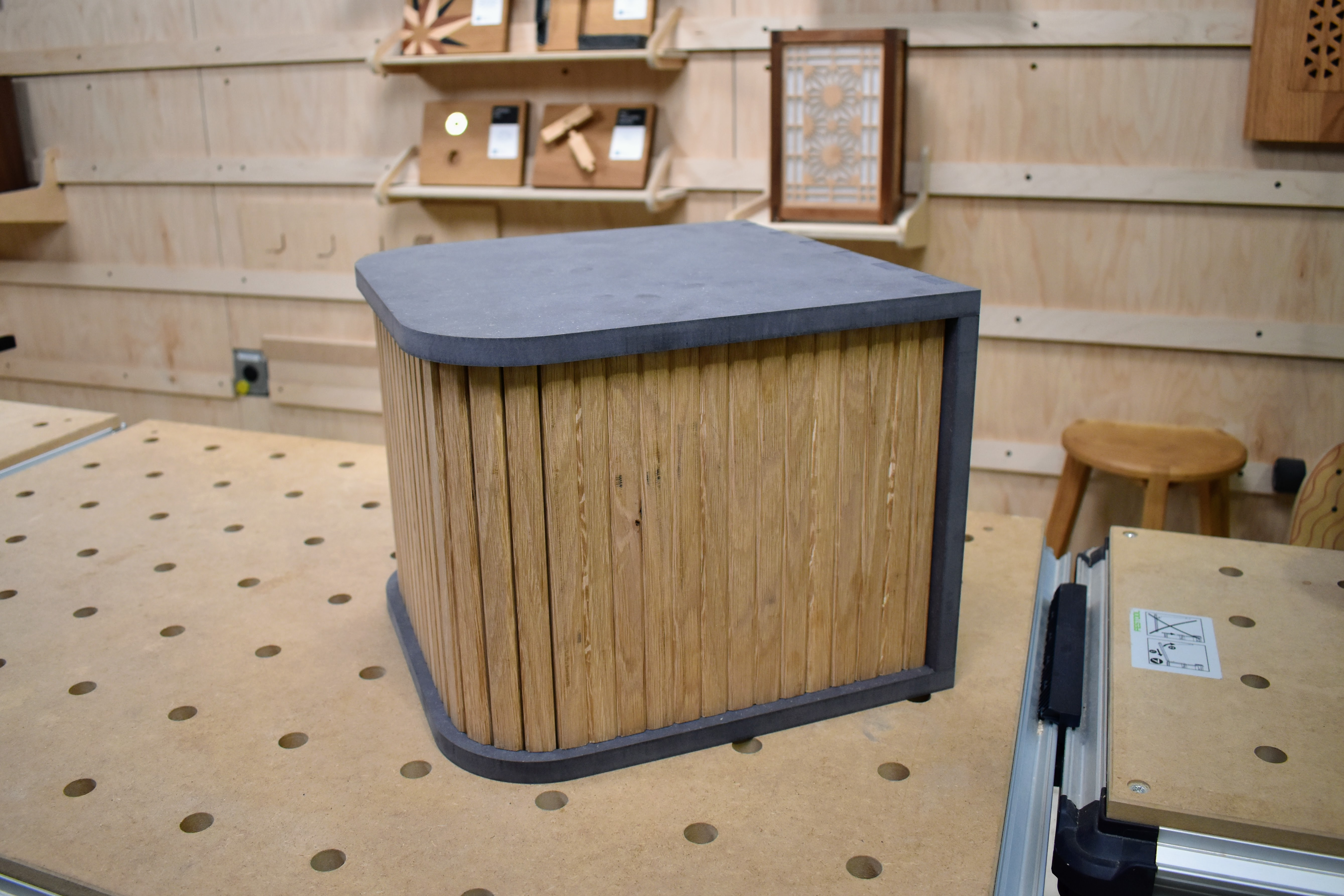 A small bedside table with a white oak tambour door and a sheet stock case. As Seen on Sessions.