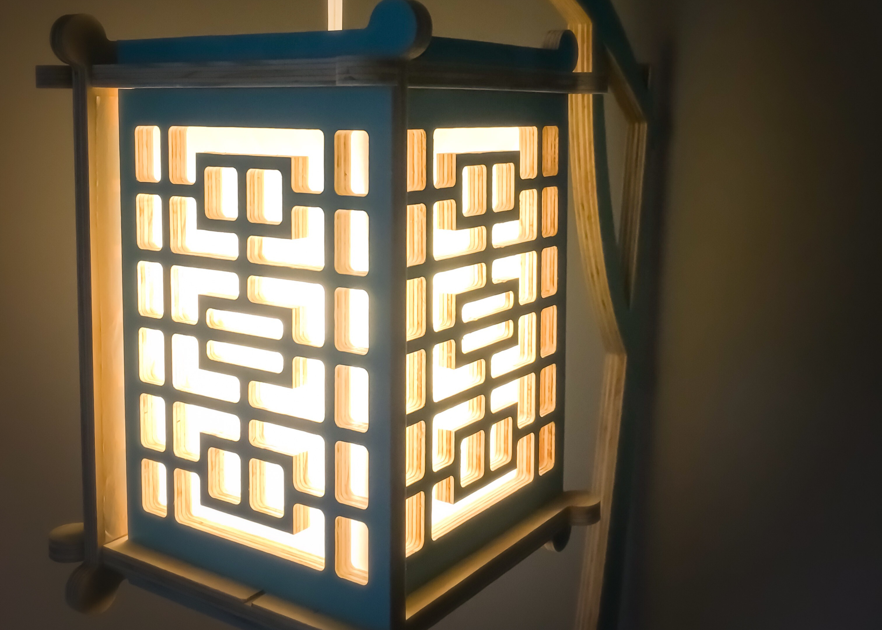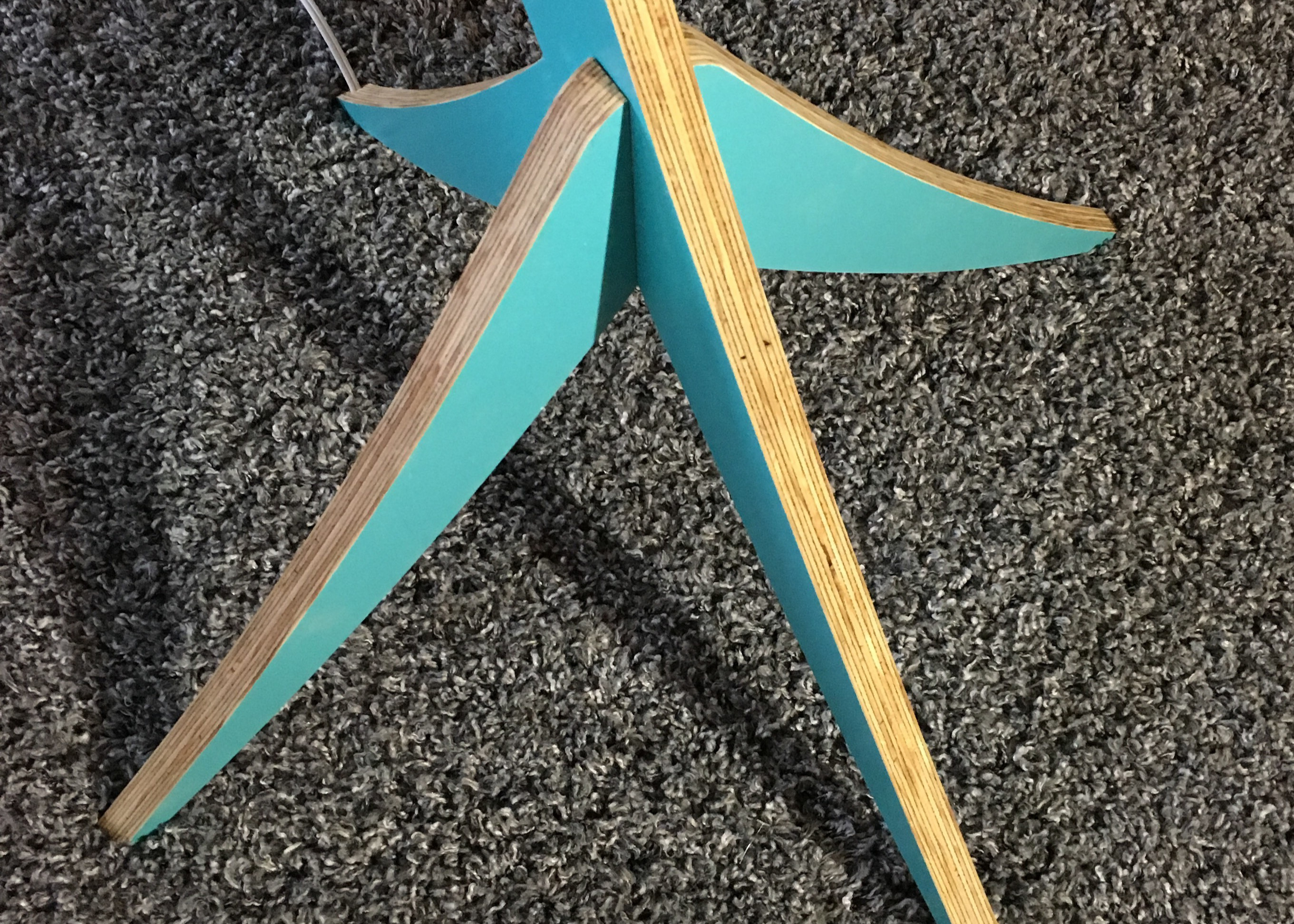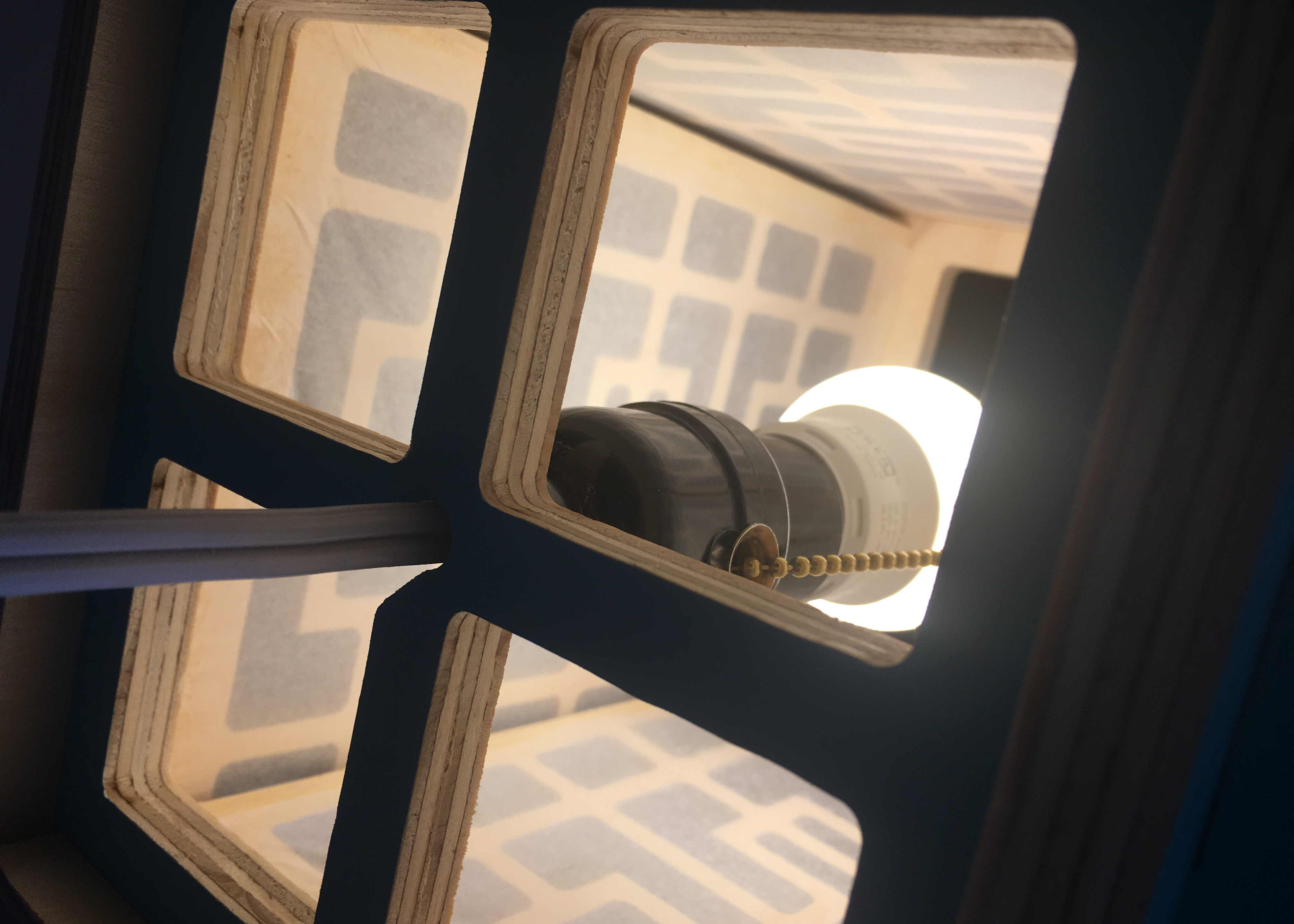 Determine the actual thickness of your material. The SVGs are made for exactly 1/2". You can either adjust them on the tool with offsets, or use the material thickness parameter in the included Fusion360 files (if you do this, be sure to extend the ends of the lamp-wire channels in Adobe Illustrator or alike, after exporting your SVG). Note: the parts of the stand are made from gluing two layers together, so the slots to attach the stand and legs together are material thicknessx2. Stand: 1. Prime and paint the good side of your plywood. Use plenty of two sided tape on the painted side to attach it to a spoiler sheet painted side down such that you will be doing your cutting from the back side. 2. Shaper-tape the entire sheet and scan a new workspace. Place the "LolaLampStand_layout" file using a grid. It is just under 4'x8', check to see that it is placed so that none of the parts extend off of the plywood. 3. Cut with a 1/4" bit using the normal procedure for offsets and finishing passes. Make the channel for the lamp wire 1/4" deep. 4. Remove all tape, place the lamp wire in the channel of one side, and glue the two stand pieces together painted sides out, sandwiching the lamp wire in place. Leave the desired length of wire at the top for the height you want the shade to hang, as it doesn't slide through the channel once assembled. I used some 23 gauge pins to keep the pieces perfectly aligned wile clamping, and clamping cauls to prevent damaging the paint. 5. Do the same with the leg pieces. 6. Square off the inside corners in the joint slots so that the pieces can slide completely together. I thought this looked better than dog-bone cuts. 7. Sand the edges perfectly flush and apply finish to cut edge. 8. Attach the legs to the stand. Shade: While I have included a SVG of the pieces all layed out together, I recommend doing one piece at a time, using the SVGs of the individual parts to enable you to use pieces of leftover plywood from cutting the stand, which is already painted. 1. Set up a Shaper-taped board of the thickness of your material. The pieces are small enough that you wont need to put Shaper-tape on the actual work piece. 2. Cut four "fins", one "top hub" and one "bottom hub". I used a 1/4" bit and left the rounded inside corners that resulted. For cutting the fins: the larger spaces cut out of the grille design will result in small waste pieces inside which could come loose and be dangerous. An easy way to get around this is to start with an offset of about 0.2", which will enable you to use the helix function to take out this material full depth in one go, and is much quicker than multiple passes in "pocket" mode. 3. Use a glue-stick to attach tissue paper to the back side of each fin, covering the openings in the grille. 4. Assemble the shade and hang on the lamp socket. Be sure that the lamp socket is installed well enough to be able to hold the weight of the shade.
