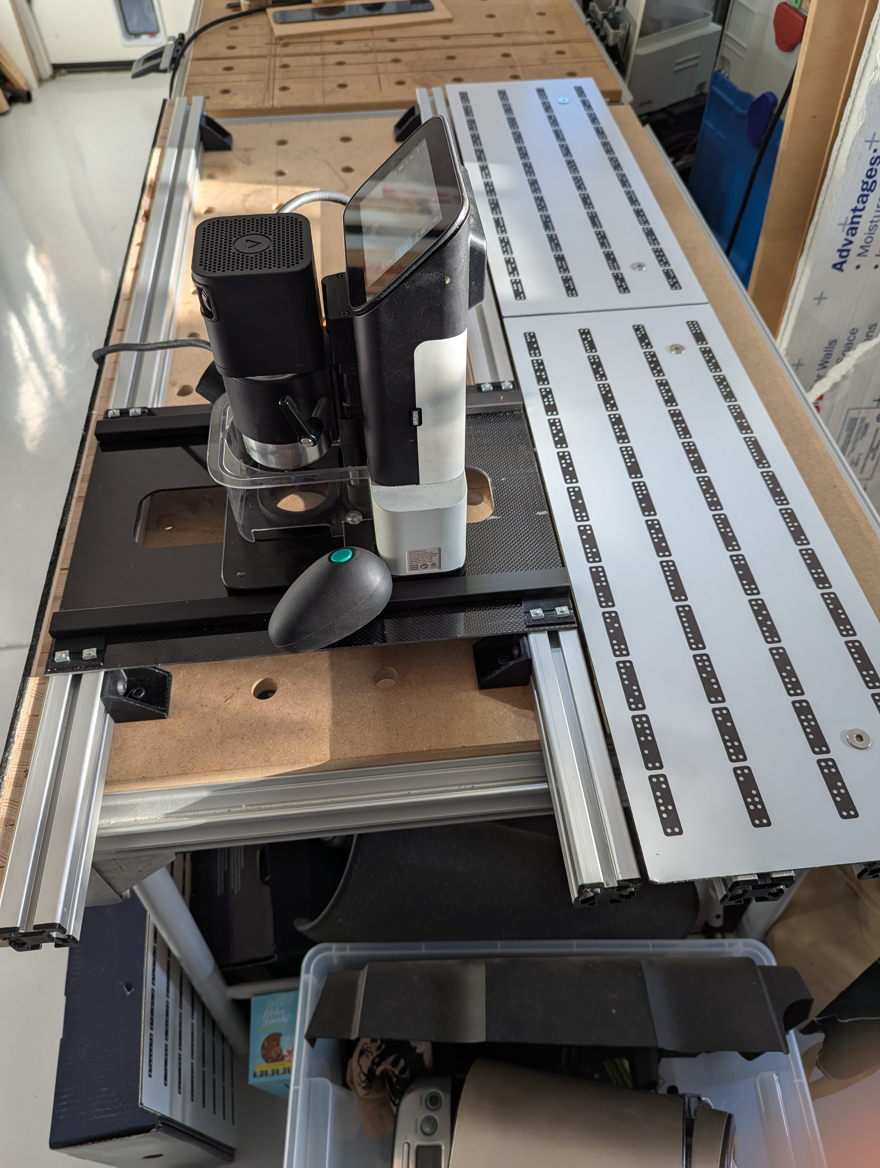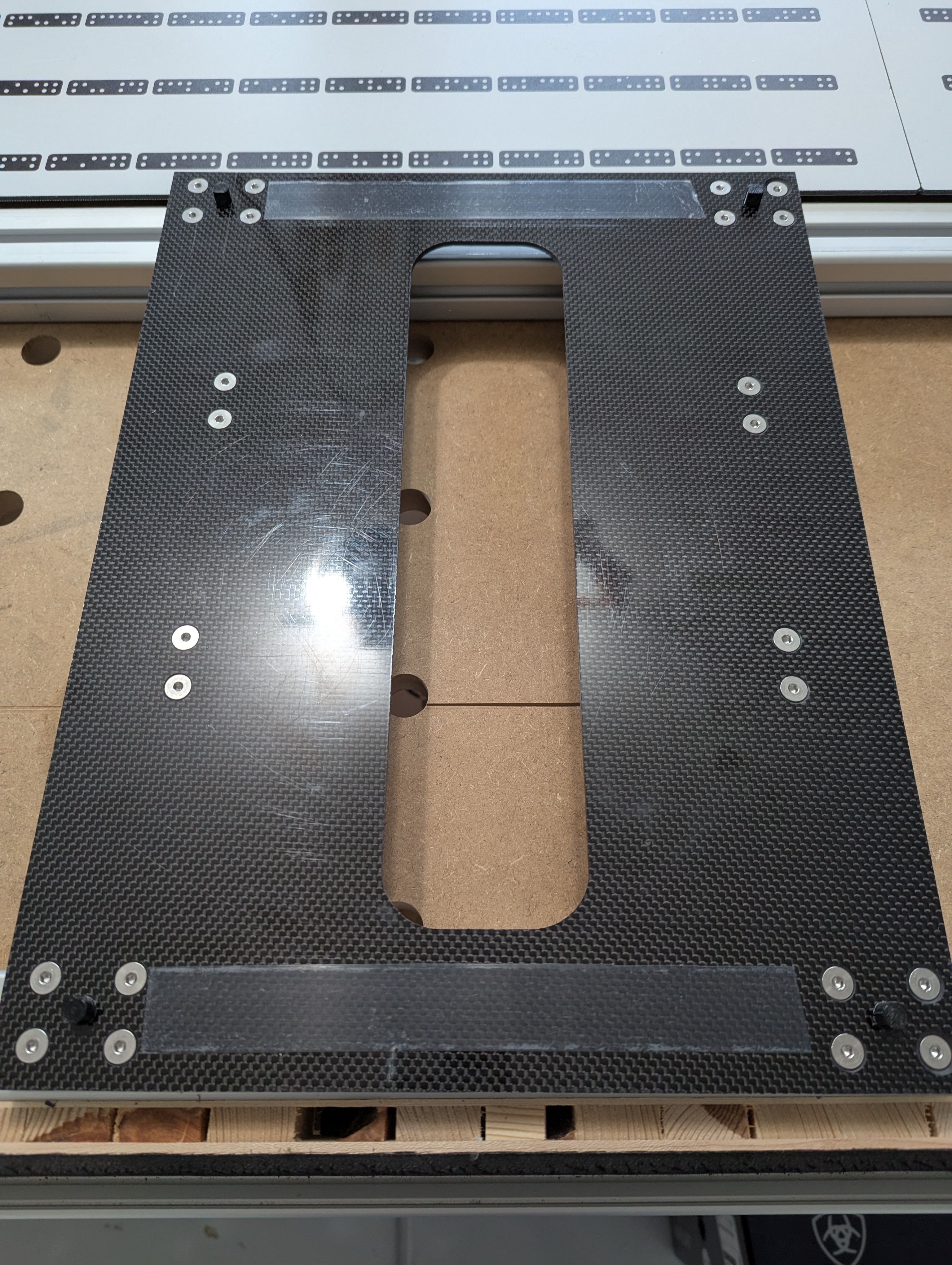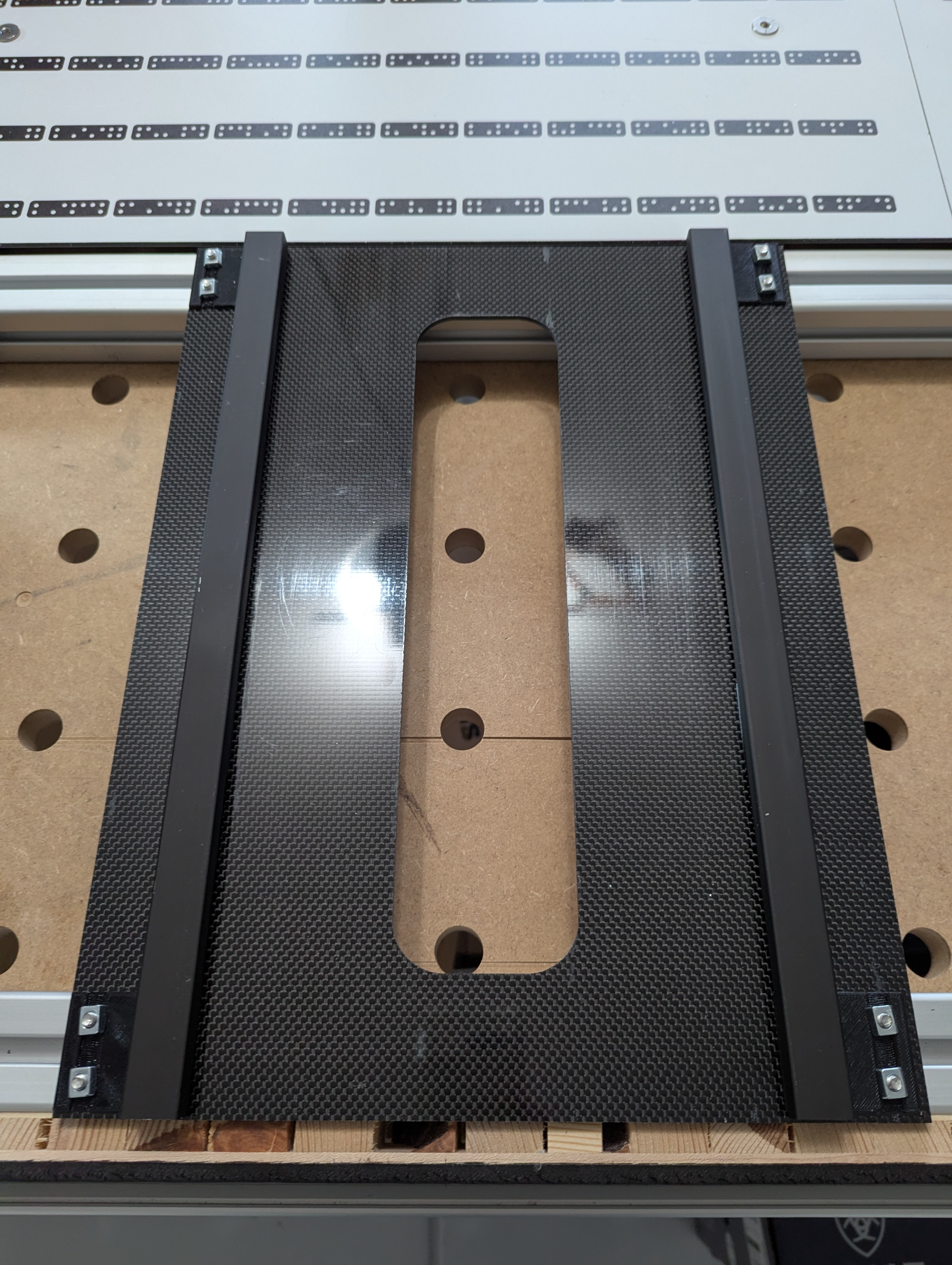 This project is built upon another one ( https://hub.shapertools.com/creators/5bcf493945760d0017441fce/shares/65236d8451c7c2cbbfdc8457 ). In particular the 3d printed feets for connecting the 40mm aluminium extrusion to the MFT table. The sled cariage is based on the original ZedSled ( https://hub.shapertools.com/creators/63b611f2fbe48653c207db8d/shares/6632aa366036cdb4caa5a7c6 ) The connection with the t-track is different, it relies on 3d printe feet at: https://www.printables.com/model/956433-connector-for-zedsled-mft. The carbon fiber dust is nasty take proper precautions. The sheet comes from amazon: https://www.amazon.com/dp/B09WY46K27?psc=1&ref=ppx_yo2ov_dt_b_product_details, as well as the 20x10mm rail ( https://www.amazon.com/dp/B0CQSXCLHR?ref=ppx_yo2ov_dt_b_product_details&th=1 ) The domino panels are printed on dibon aluminium from AxiomPrint, using https://browncowww.pythonanywhere.com/ (parameters included). Holes are added in the 24x18 panel and then it is cut in 2. A fusion360 file is enclosed to describe all the parts.