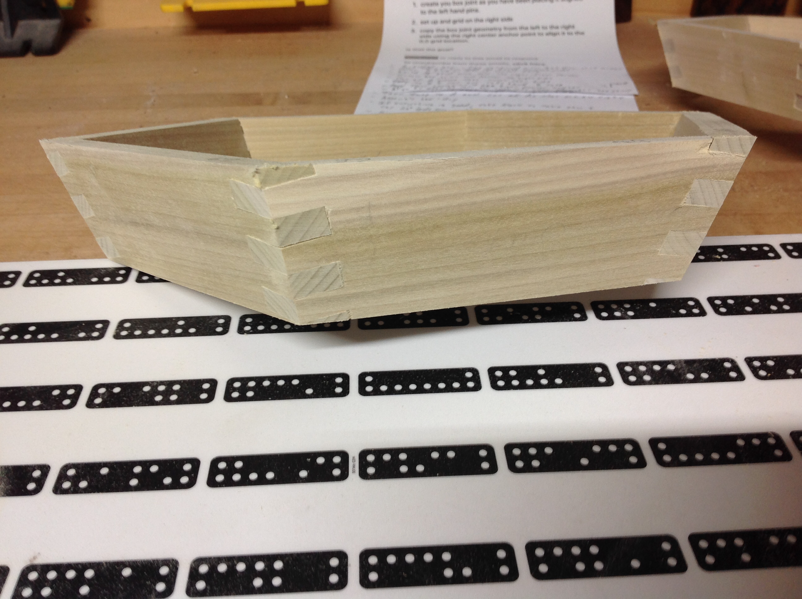 As the sides of the box splay outward the angles move away from 90/0. It's like cutting compound angles on cove molding. Use the chart above to cut angles on ends of all boards. When you set a grid using the angled edge for X axis you need to anchor the box joint to a negative y axis grid number. A 1/4" should be enough but carefully use guide cut to ensure all metal parts are clear of the cutter route. The thicker the wood or steeper the angle the further back you need the anchor point. You need to mirror the box joint to cut half the pieces. The process for mirroring the box joints involves copying the left hand box joint setup which is anchored to the right center and anchoring the copy which is anchored to the left center to the other side right next to your original. Cut half your ends on the left ( A's and B's) Then cut the other ends on the right side (A's and B's). Pay close attention to getting the acute angle of each piece exactly on your reference and flush to the horizontal and joints are very nice.