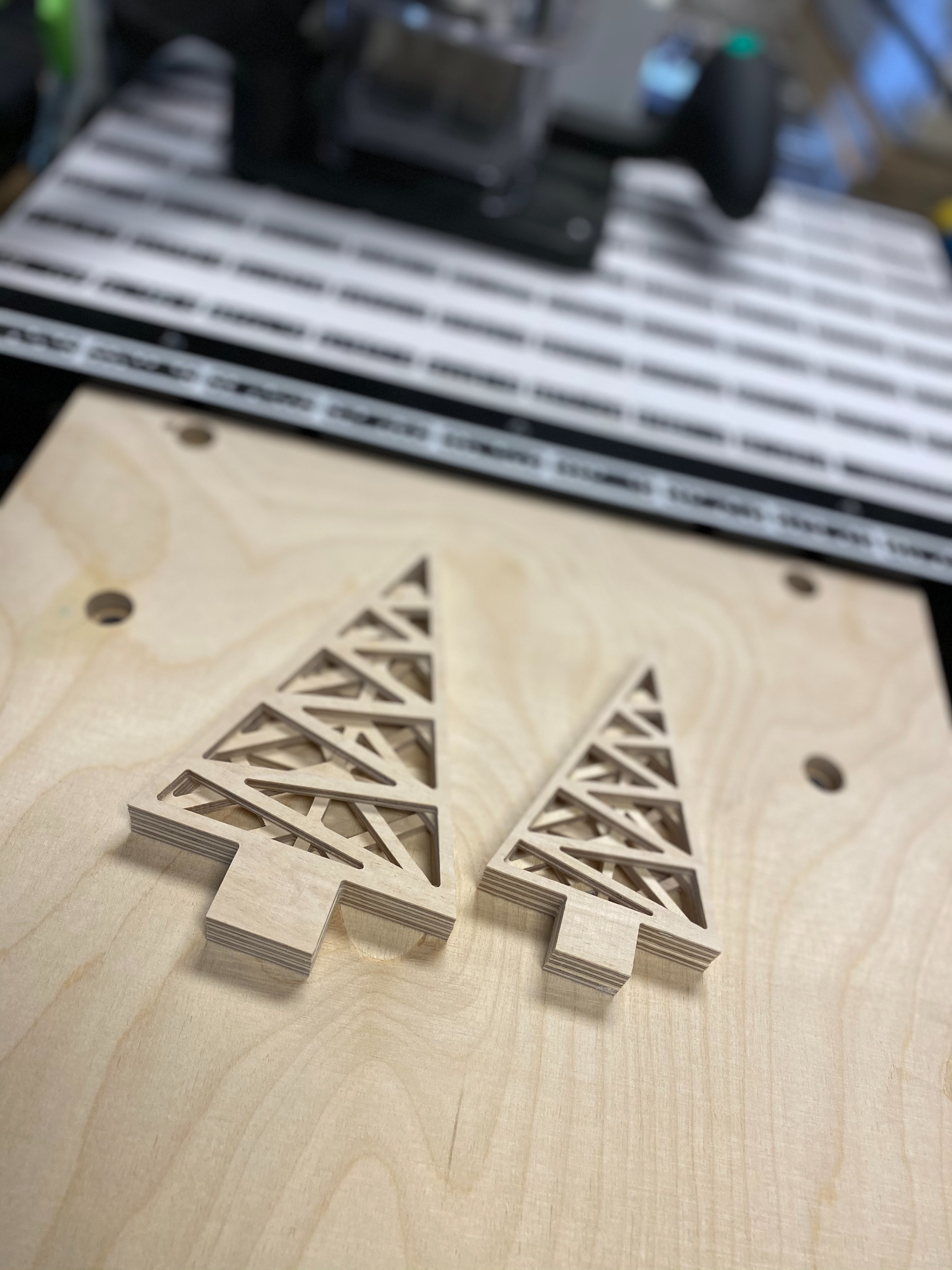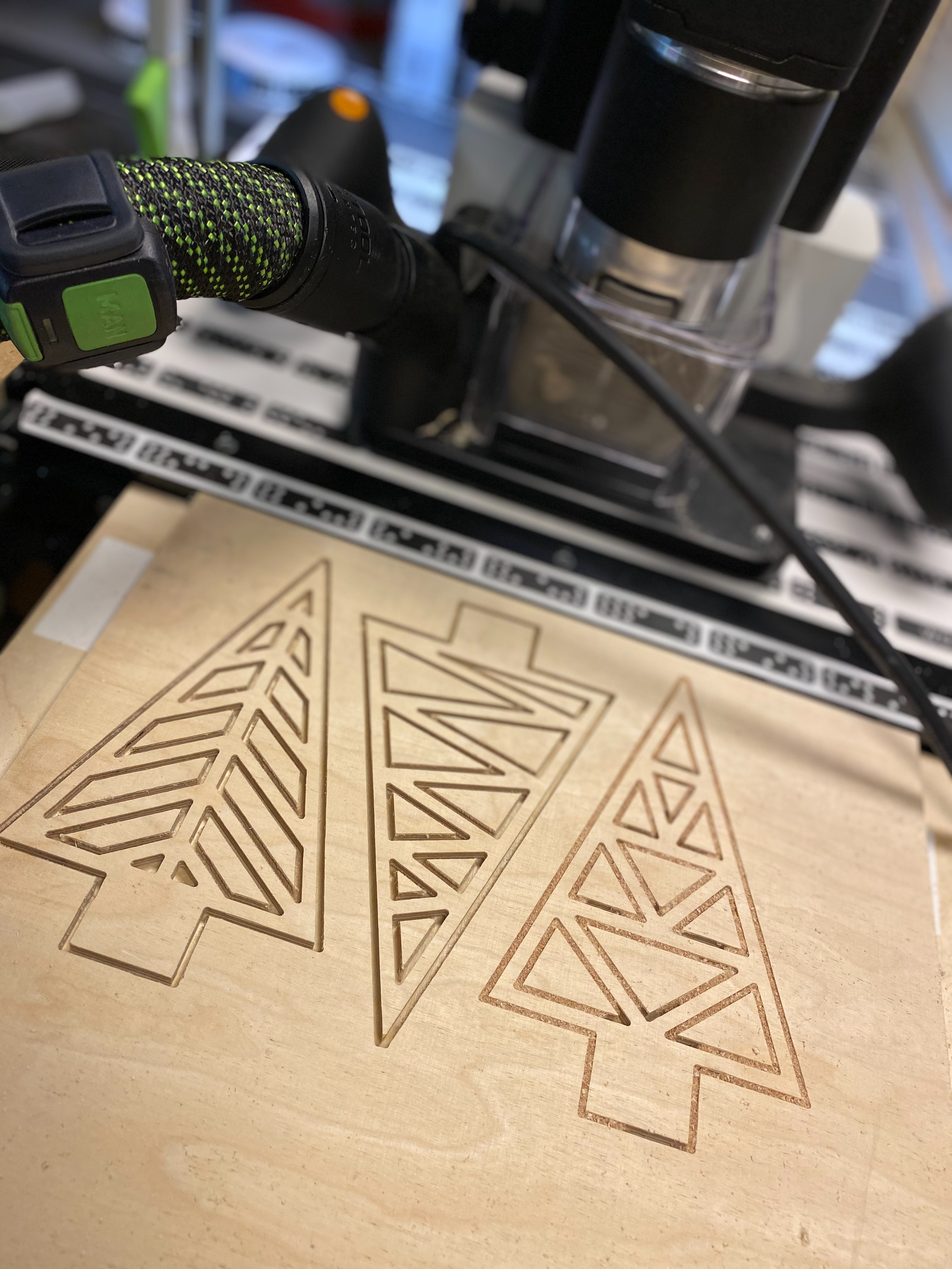 Trees are made from 300 x 300 mm plywood sheet, prepare it with "nesting" to safe materials. Use 1,5mm router bit for small trees and 3,0mm router bit for big trees. Work true material and you will get the trees. Finish the trees first with sandpaper P150 for edges and P280 for surface. Base is made from 350 x 50 mm plywood piece. Use 3,0mm router bit for grooves on top of the base to fix later trees. Try it step by step with "offset" to get the right size of your grooves compare to thickness of your trees. For the outline you can use 8,0mm router bit. Finish the base first with sandpaper P150 for edges and P280 for surface. Now you can put trees and base together. Finish.