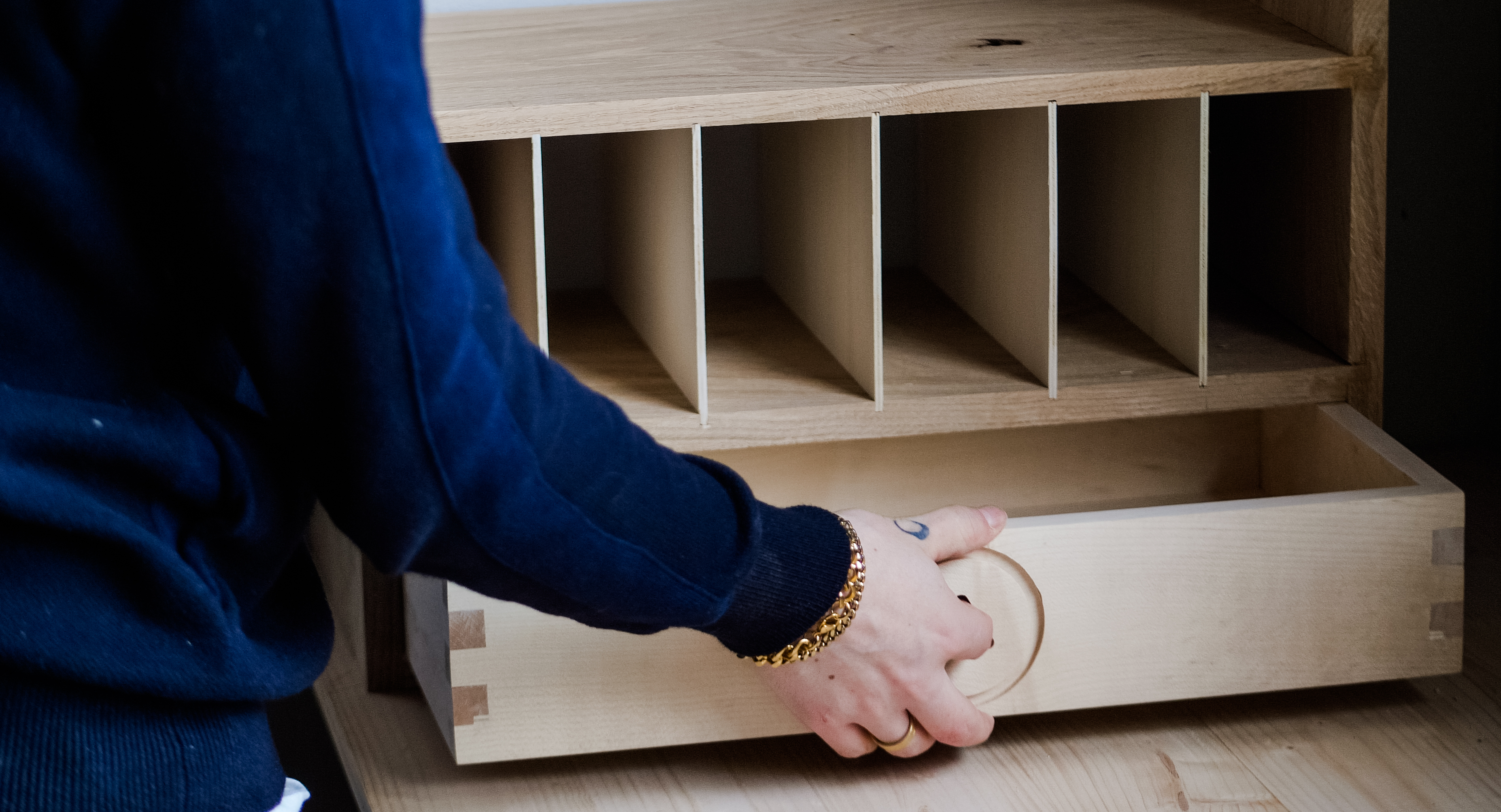 Dieser Werkzeugschrank ist eine elegante Mischung aus praktischem Funktionsmöbel und klarem Design. Besondere Highlights sind der individuell gestaltbare Schubladengriff sowie die Gehäuse- und Schubladenkonstruktion mit Fingerzinkenverbindung. This tool cabinet is an elegant combination of utilitarian function and clean design. Special highlights include the customizable drawer pull, as well as the box jointed case and drawer construction.