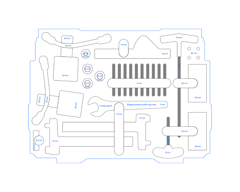 based on Sam's Shaper Workstation Accessories Kit (https://hub.shapertools.com/cloud/Shaper%20Workstation%20Accessories%20Kit%20A), but slightly modified: - pen removed - one collet removed (3 instead of 4) - Crescent Wrench is type A - original short 4 mm Allen Wrench added (lower right corner) - 4 fastening screws for Workstation added (upper right corner) - USB-Stick added (lower left corner) - parts rearranged