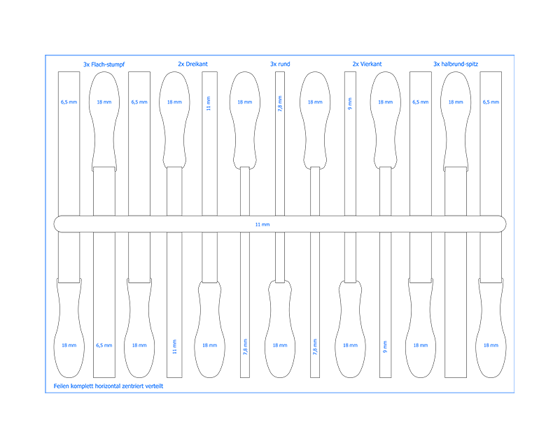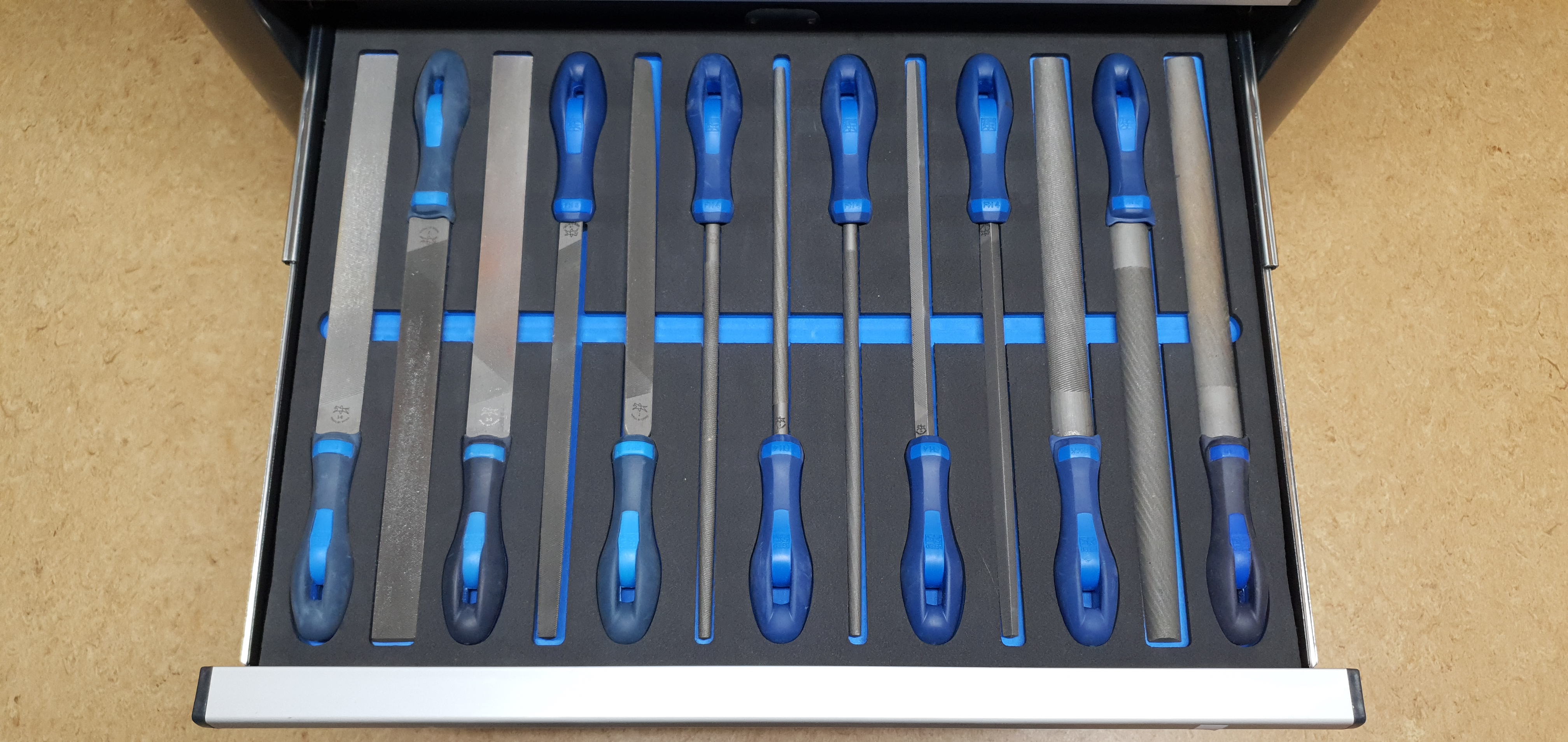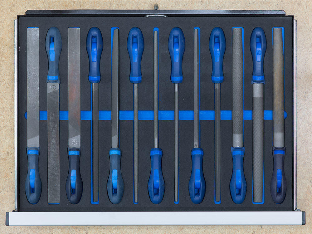 To improve the organization of my tools in my small workshop, I've bought a tool trolley from the german company BGS. The type of the trolley is 4103, a model with 11 drawers. The size of the drawers is 569 mm * 470 mm. Ten of the drawers have a height of 54 mm, the 11th of 170 mm. I plan to produce shadowboards for all the shallow drawers by shaping the corresponding shape of the tools in 30 mm two-colored PE rigid foam inlays. Here I show you my shadowboard for files.