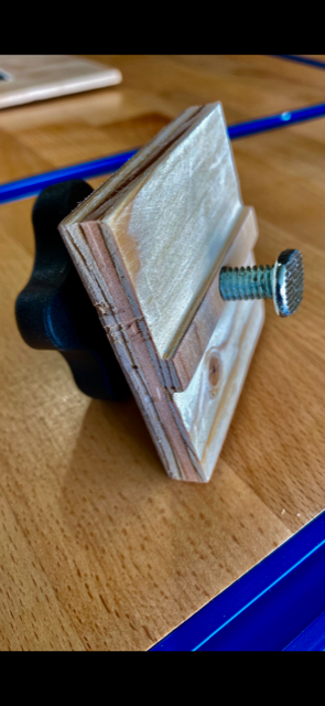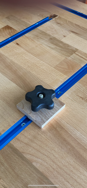 T-Track stops. 2 1/2 square so they work in either direction. Can be made from 1/2 hardwood or 1/2 plastic cutting boards. Center hole 5/16. Designed to fit Rockler T-Track.