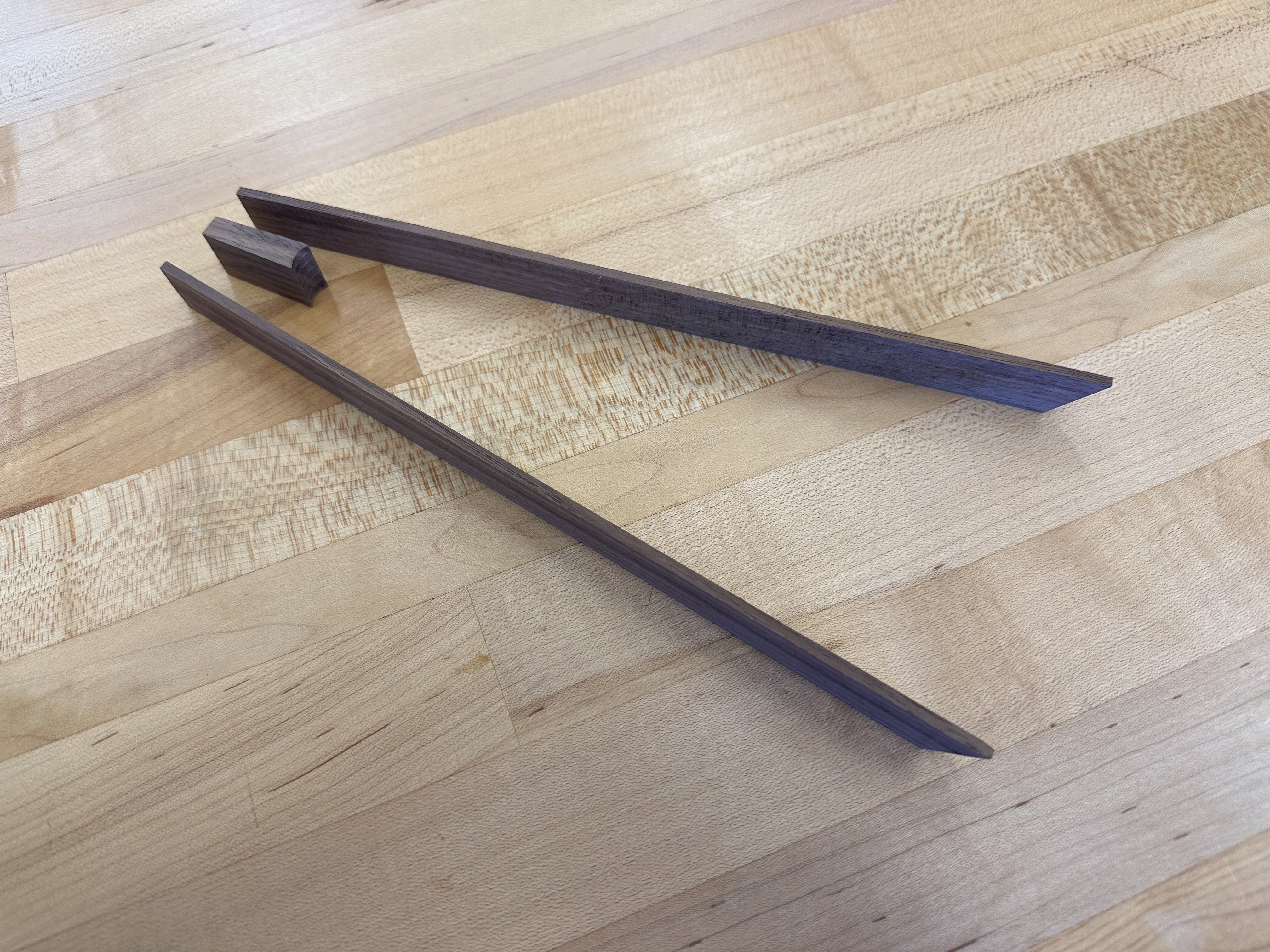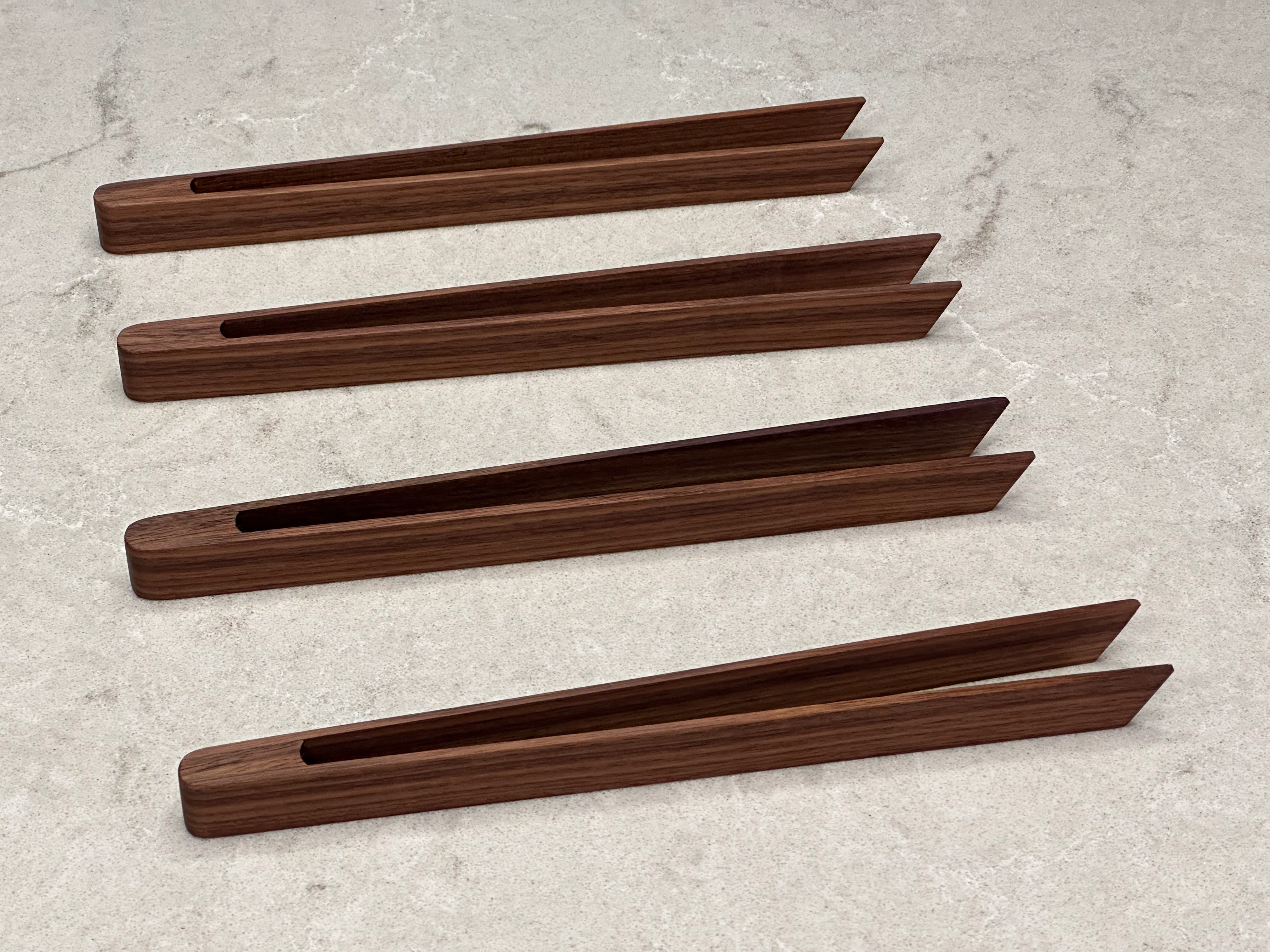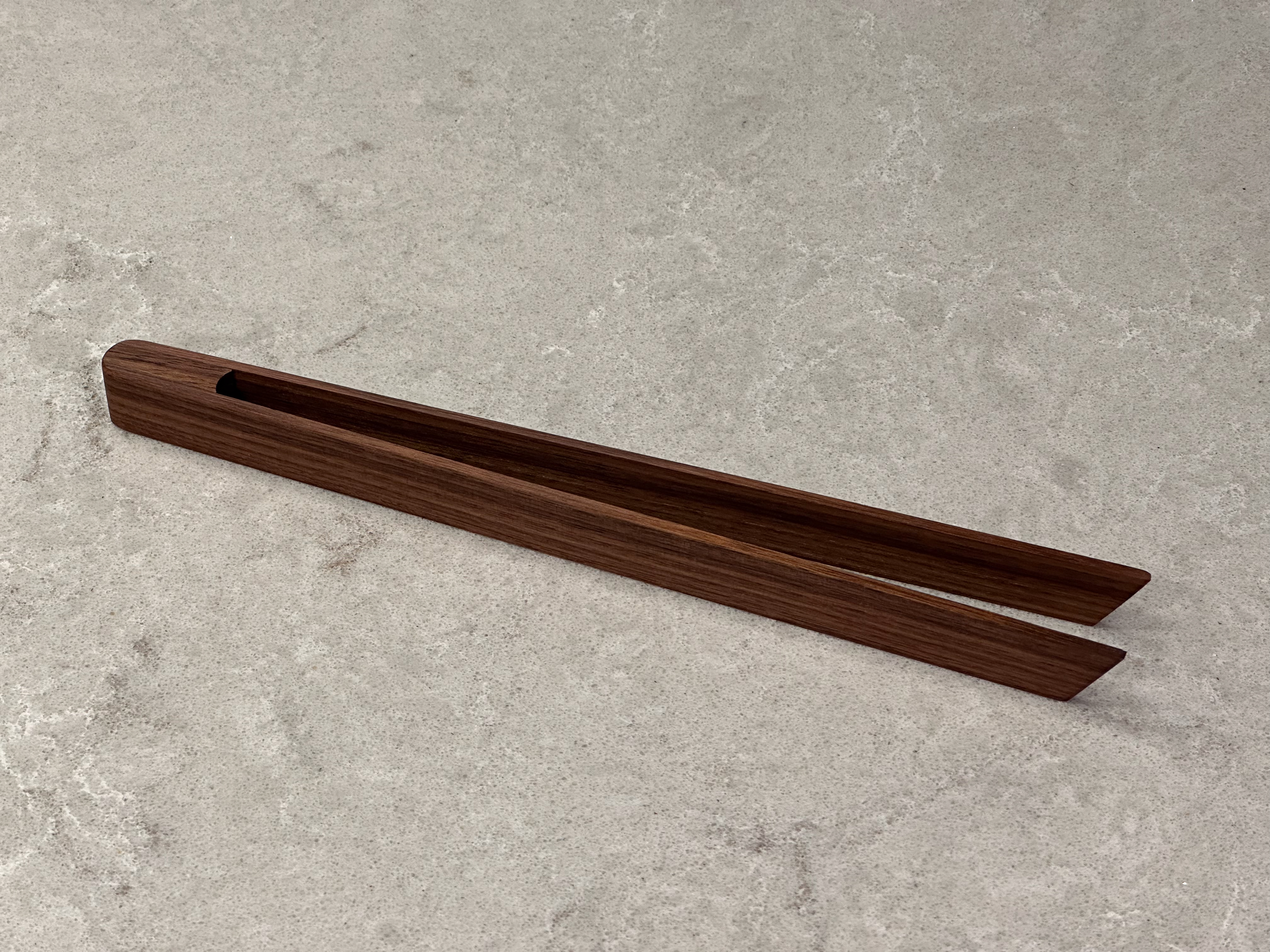 Set up to make whatever number of tongs you want. I made 4 to make it worth my time. Use the SO to cut the center angled bases. (Make sure you secure the material well!) I placed the shapes down the center of the board. I also used a 1/8" bit that could cut 3/4" deep and used *no* offset as the small pieces want to break loose and spin on the cleanup pass. Cut the side pieces to dimension: 1/8" x 3/4" x 10". You can cut one end to an angle if desired. These are cut at 30 degrees. Glue sides to angled base, preferably using water-resistant glue. Round over the base of the tongs with sander, soften any sharp edges and finish sand. Finish with food-safe finish of your choice. I used Walrus Cutting Board Oil.