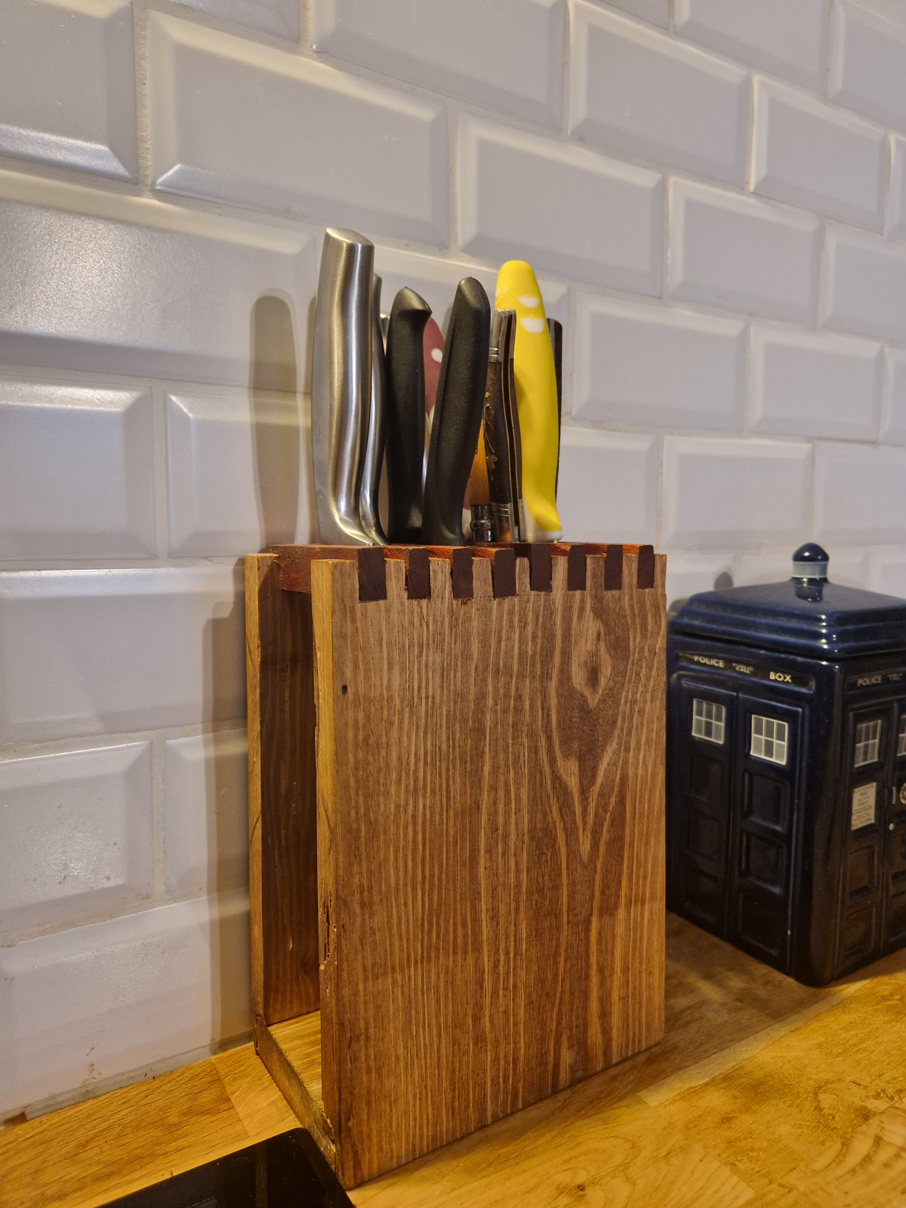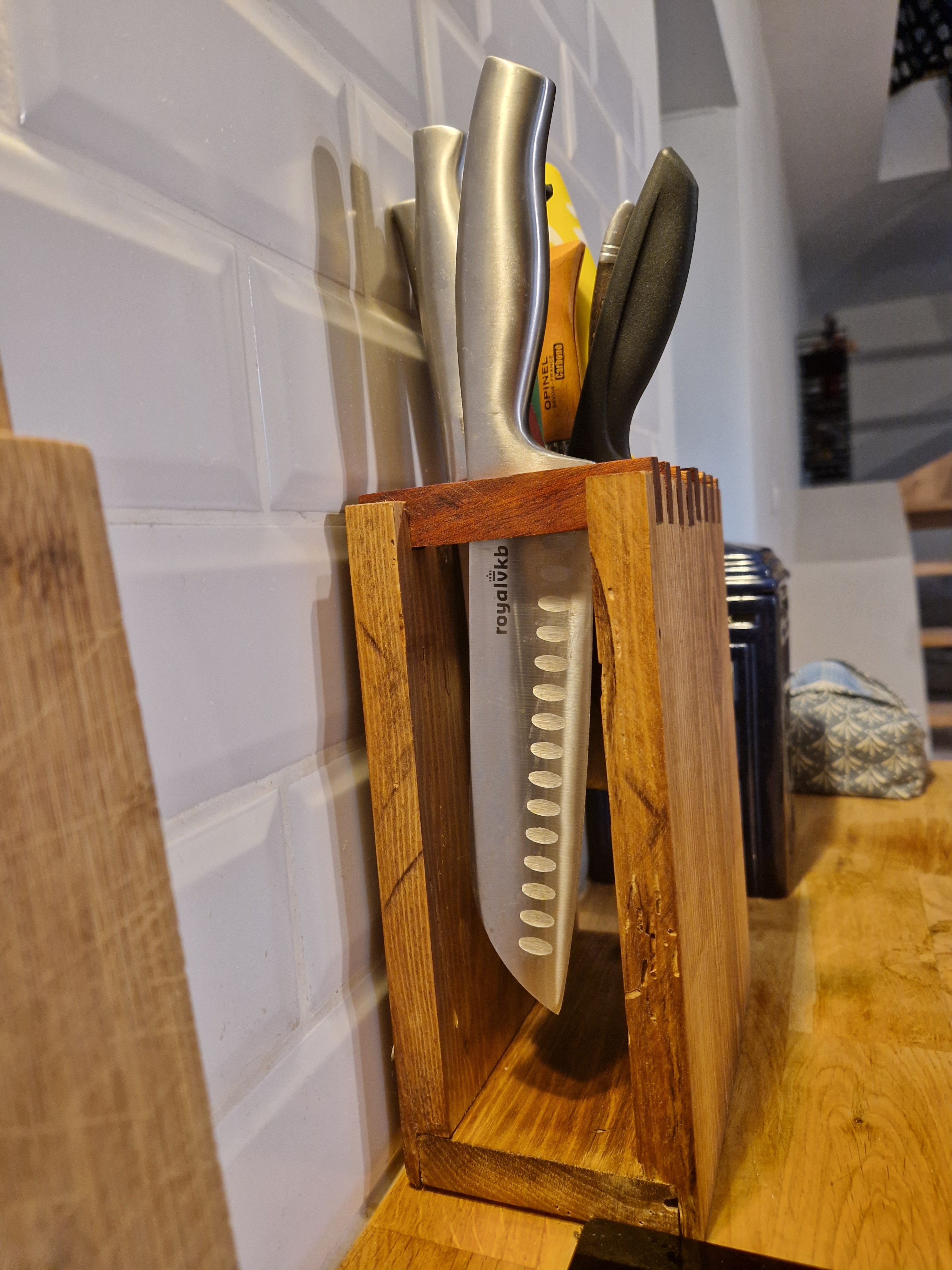 Porte couteau avec lamelles espacées d'1cm. Possibilité de le faire plus long et de faire un autre système de maintiens pour la base.