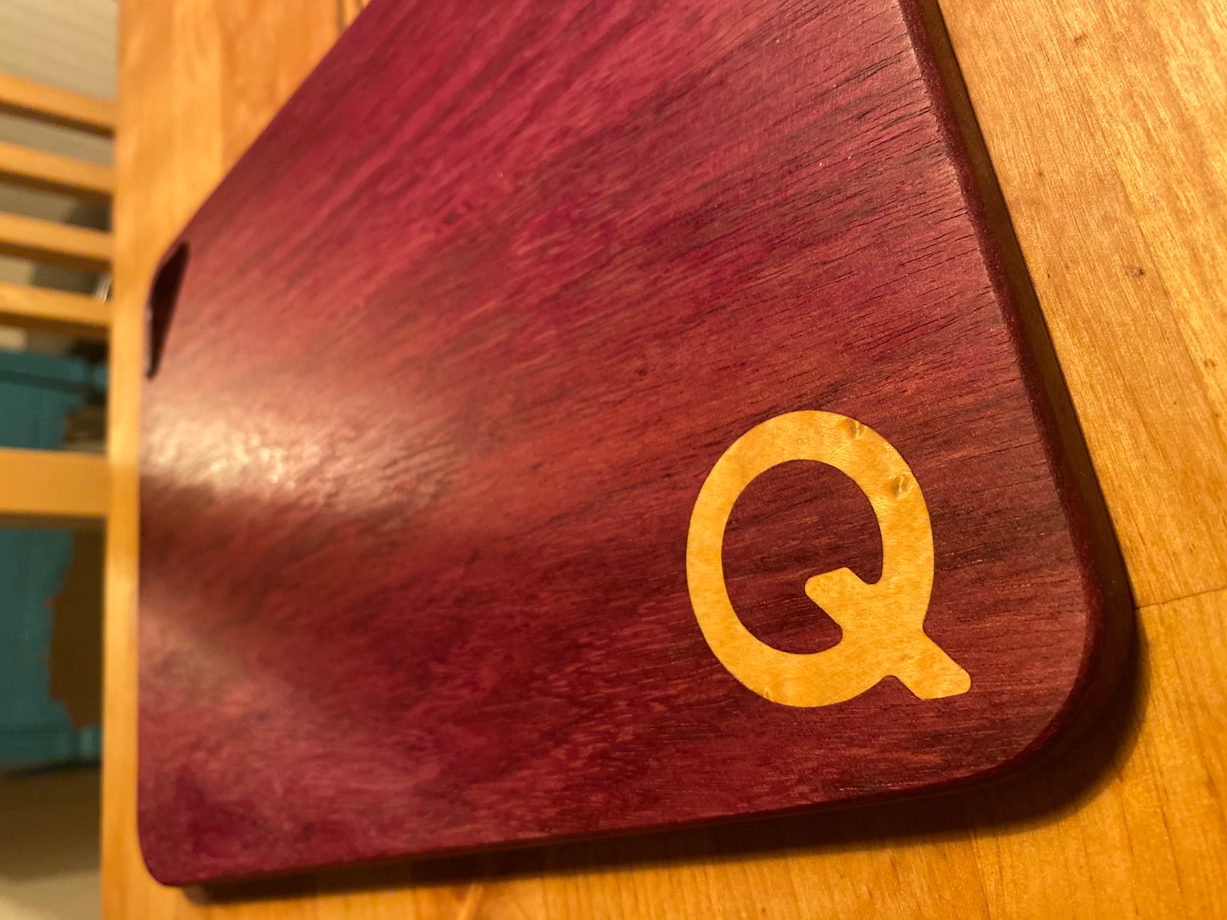 Cutting board with juice catch and carry loop made from purple heart with Birdseye maple inlay.