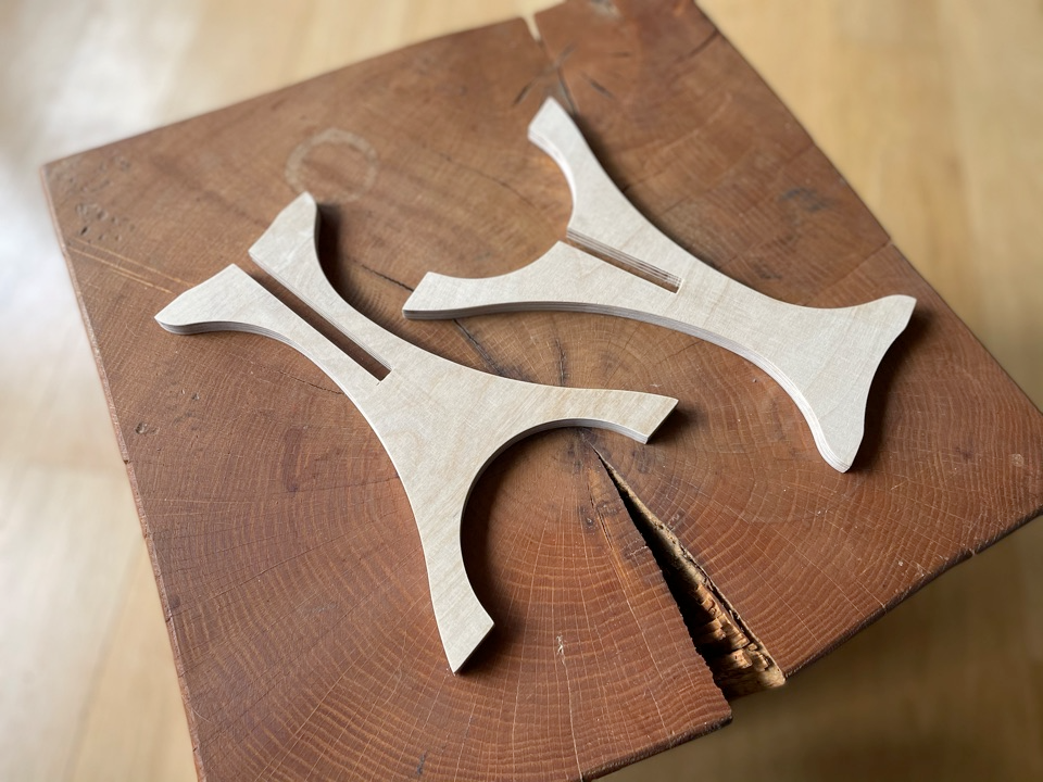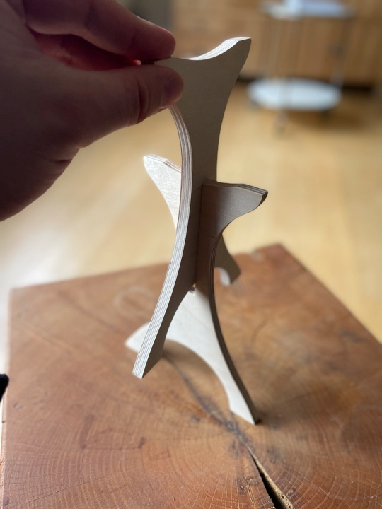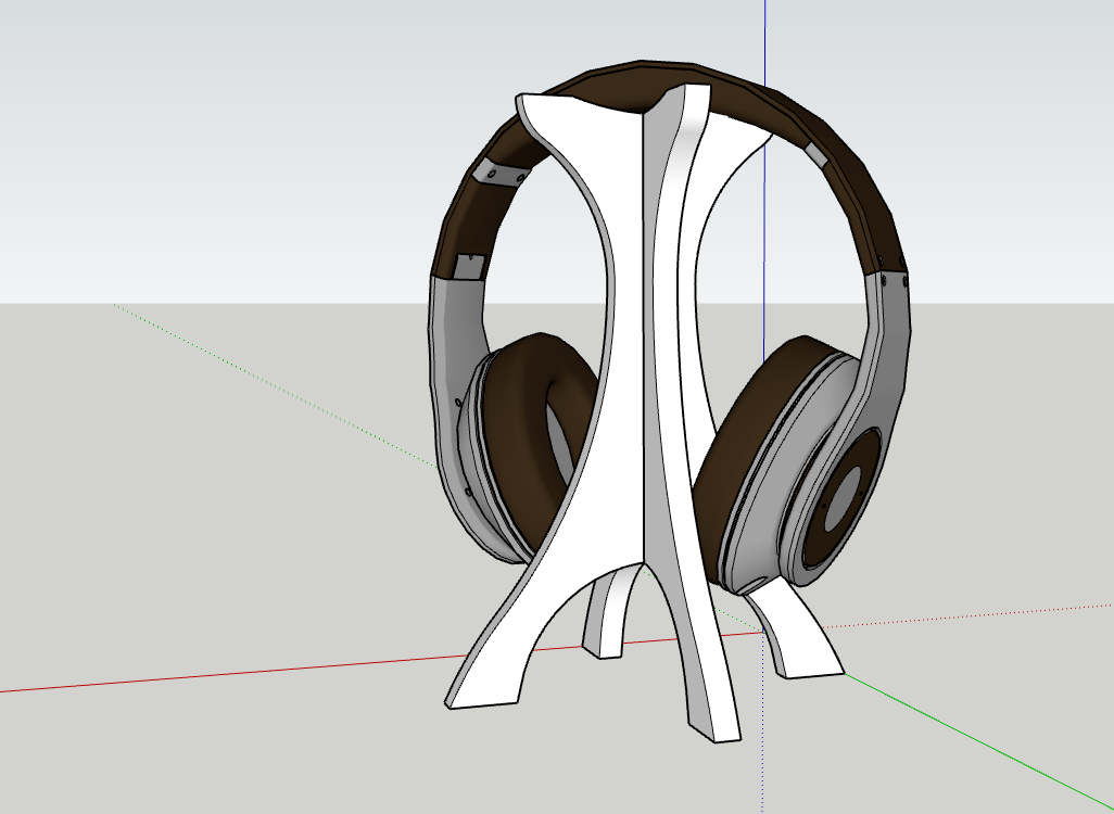 This easy headphone stand is made out of 9mm plywood and needs no glue. Should fit every common headphone and headset. If you are using non-bluetooth-headphones you can store the cord between the legs of the stand. To get a tight fit of the two parts mill the joint with an offset in several steps, checking the fit with a scap piece of 9mm ply after each pass. The .skp file can be opened with Sketchup Make 2017 (or later) for modification.