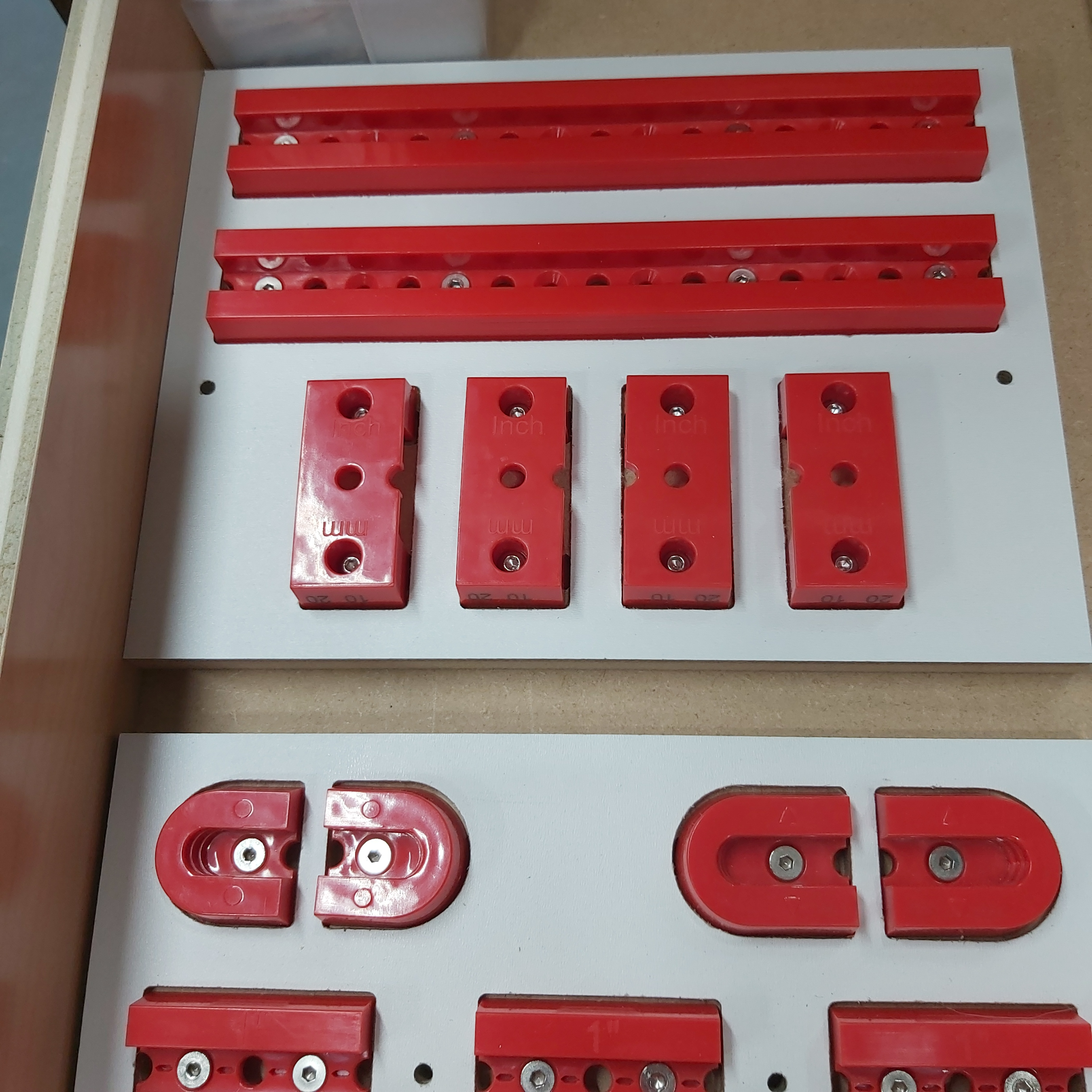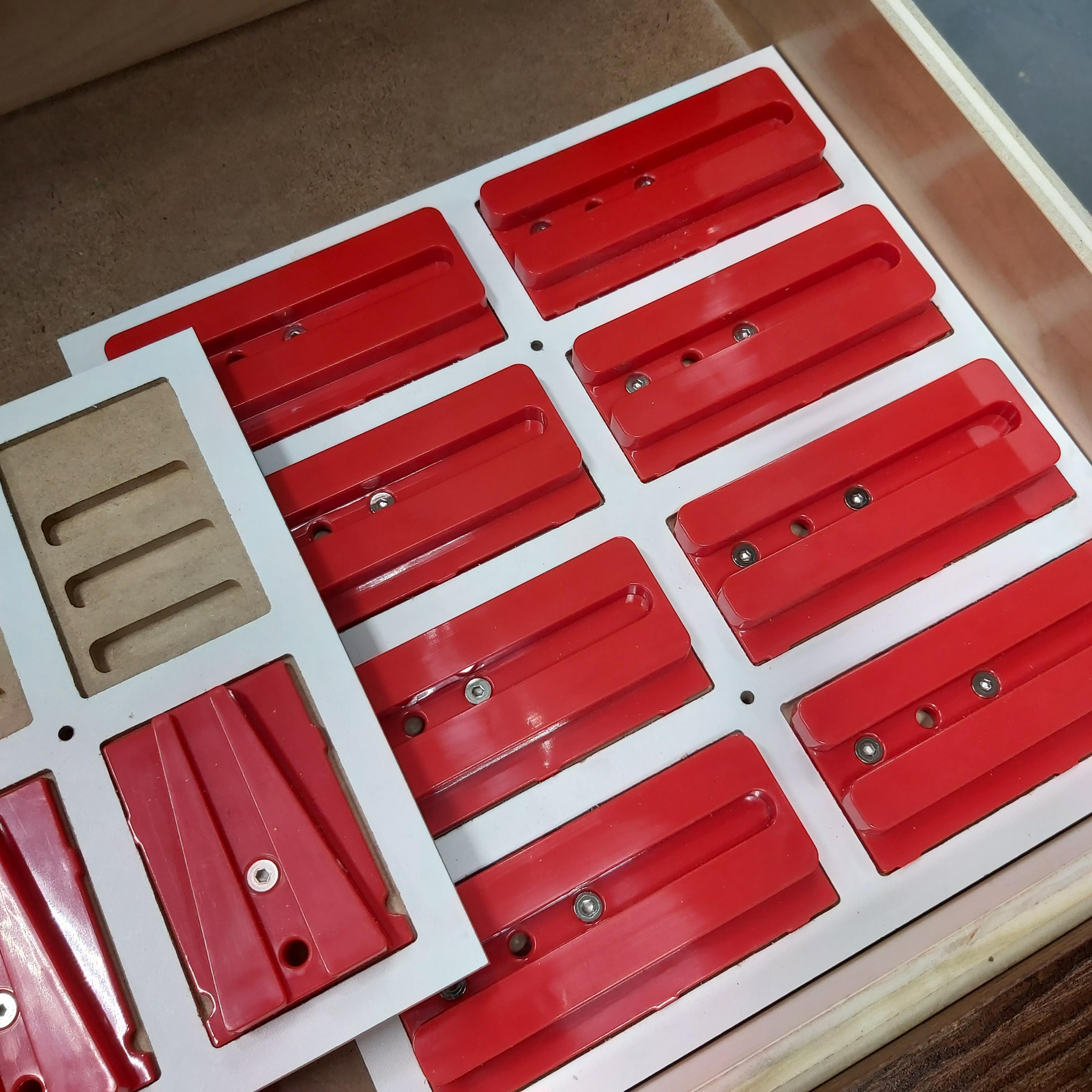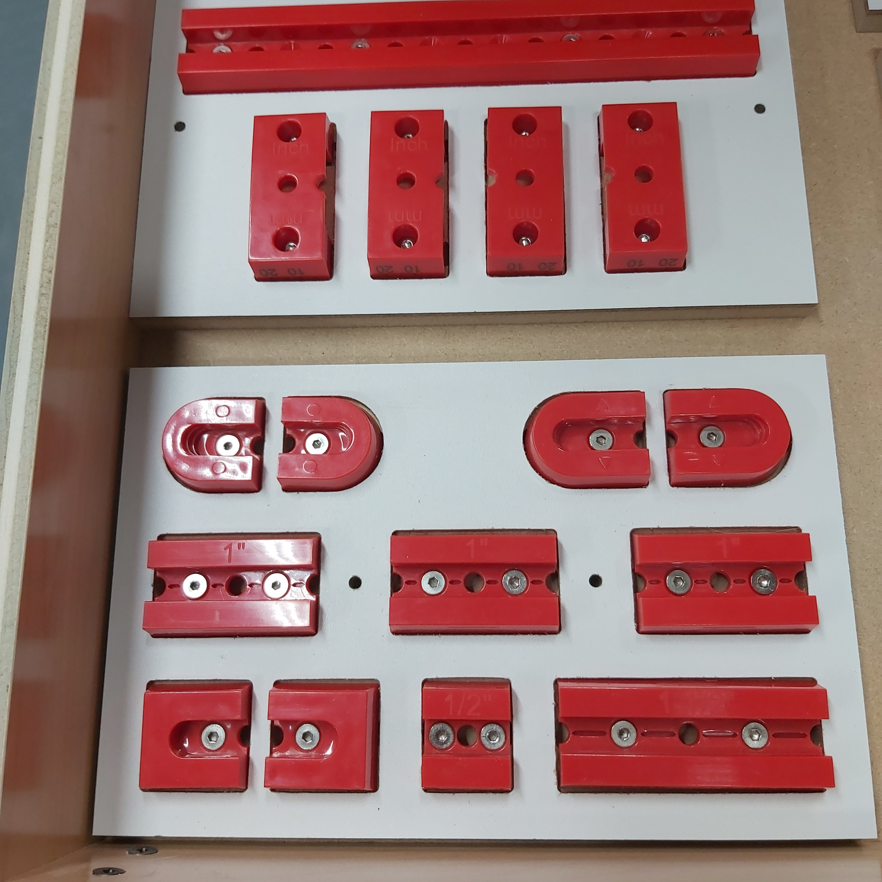 I used 1/8" masonite with a 1/8" downcut bit for the top layer of each tray. Set the cut depth slightly more than 1/8" The bottom layer is made from 3/8" MDF but thicker material could also be used. I routed the openings to 1/4" deep using a 1/4" bit. The alignment holes between the top and bottom layer should be routed with a 1/8" bit to the full depth of the MDF. Once both boards have been machined, glue them together using two 5/32" drill bits to keep the boards aligned. After the glue dries, the trays can be cut to finished size at the tablesaw