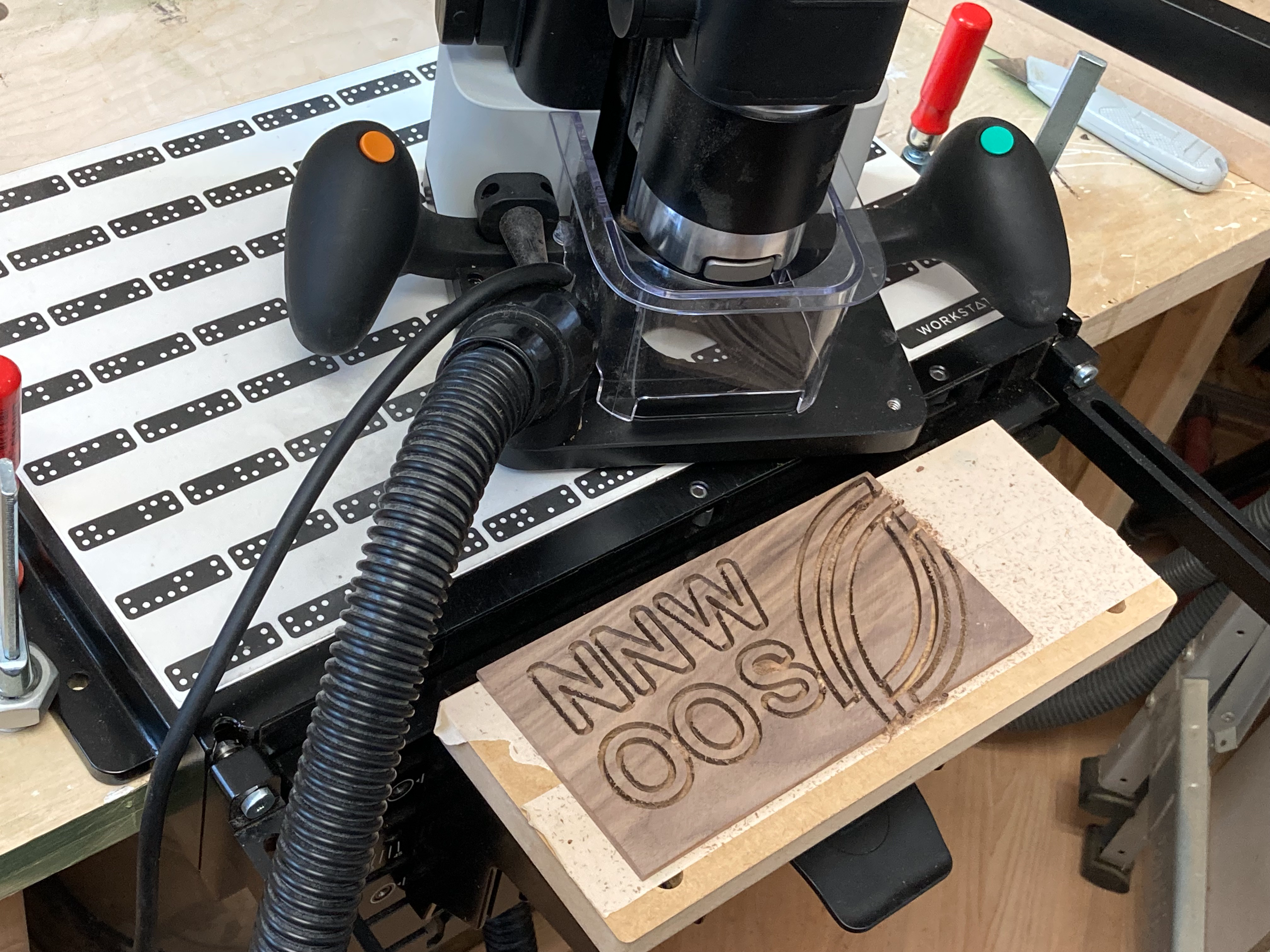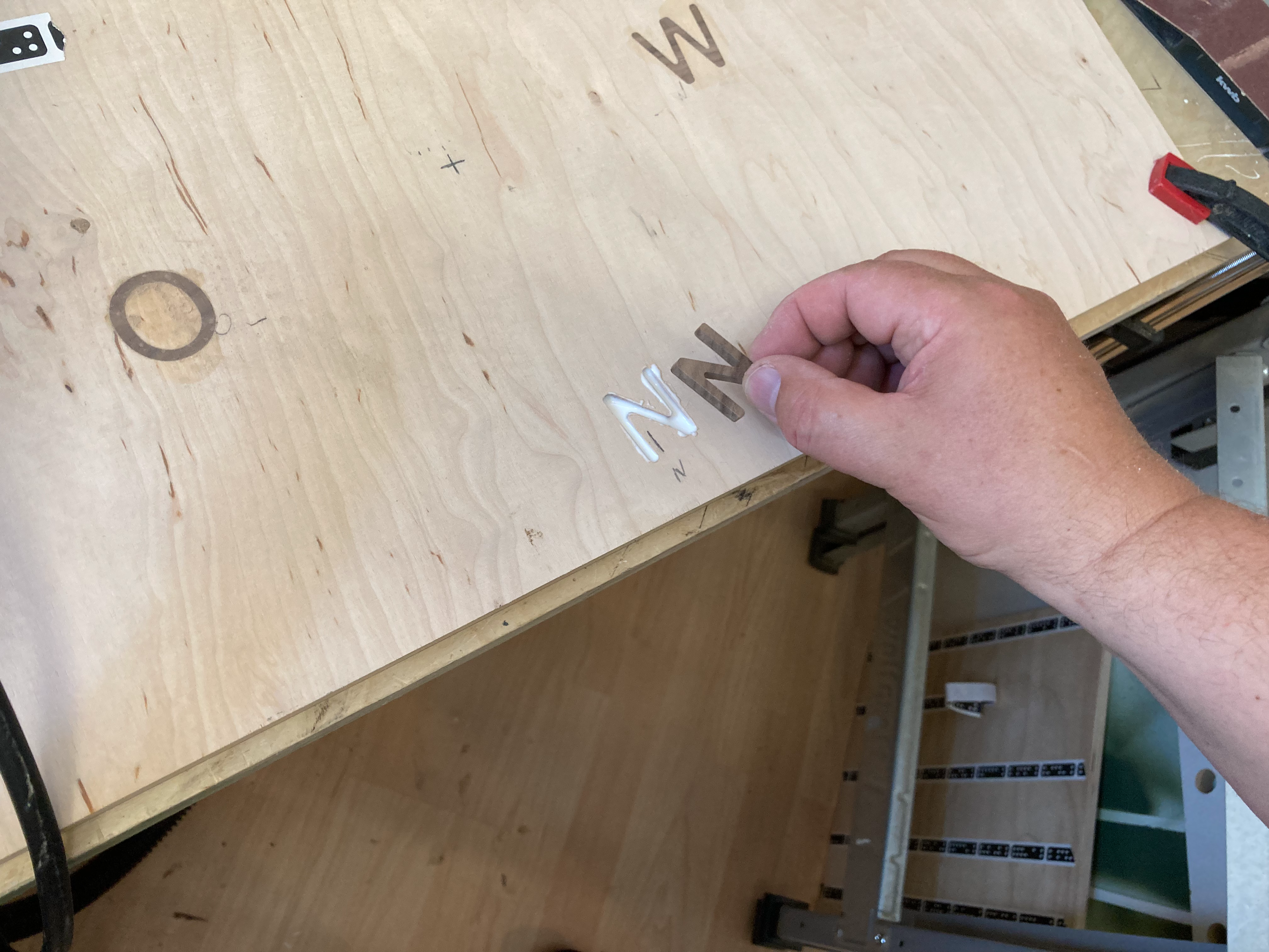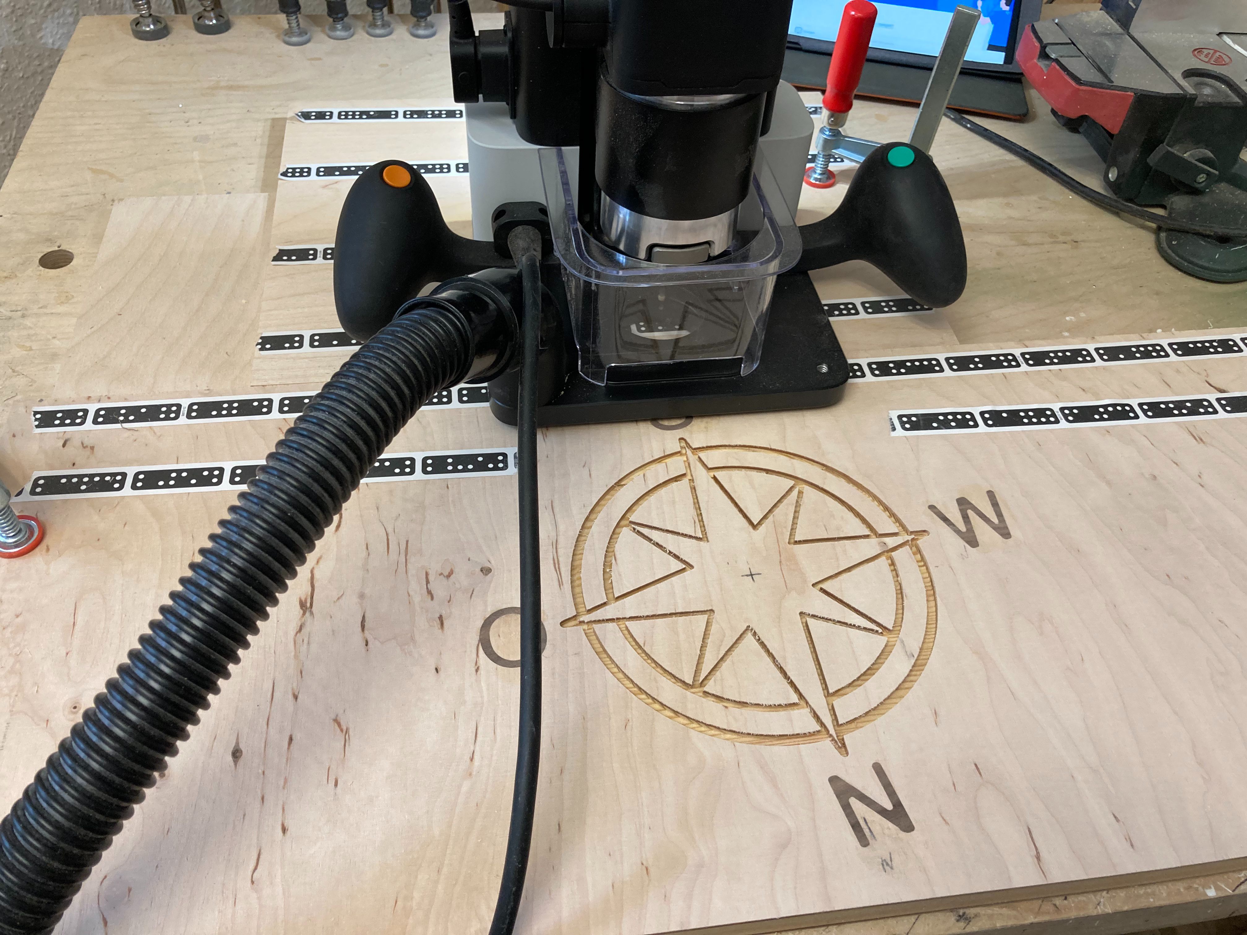 -Alle Buchstaben, Viertelkreise und Sternfragmente aus Nussbaum und Eiche fräsen. Vor-fräsen = ø3mm Tiefe 4,5mm Offset +0.1mm Finish = ø3mm Tiefe 5,1 Offset 0 -Mill all letters, quarter circles and star fragments from walnut and oak. Pre-milling = ø1/8" depth 4.5mm offset +0.1mm Finish = ø1/4" depth 5.1 offset 0 -Markierungen und Mitte auf der Grundplatte anzeichnen wohin die Himmelsrichtungen zeigen sollen. -Mark the markings and the center on the base plate where the cardinal points should point. -Negativ von Buchstaben und Kompassrose fräsen und einpassen. Tiefe 4,7mm. Offset +0.1 Kanten mit Fräser ø1/8" Tasche räumen mit Fräser ø6mm Teile einpassen, Kanten zentelweise Nachfräsen. -Mill the negative of the letters and compass rose and fit them into place. Depth 4.7mm. Offset +0.1 edges with milling cutter ø1/8" clear pocket with milling cutter ø1/4" Fit all parts, re-mill the edges piece by piece. -Buchstaben und Fragmente mit Leim einkleben und anschliessend schleifen. - Glue in letters and fragments and then sand.