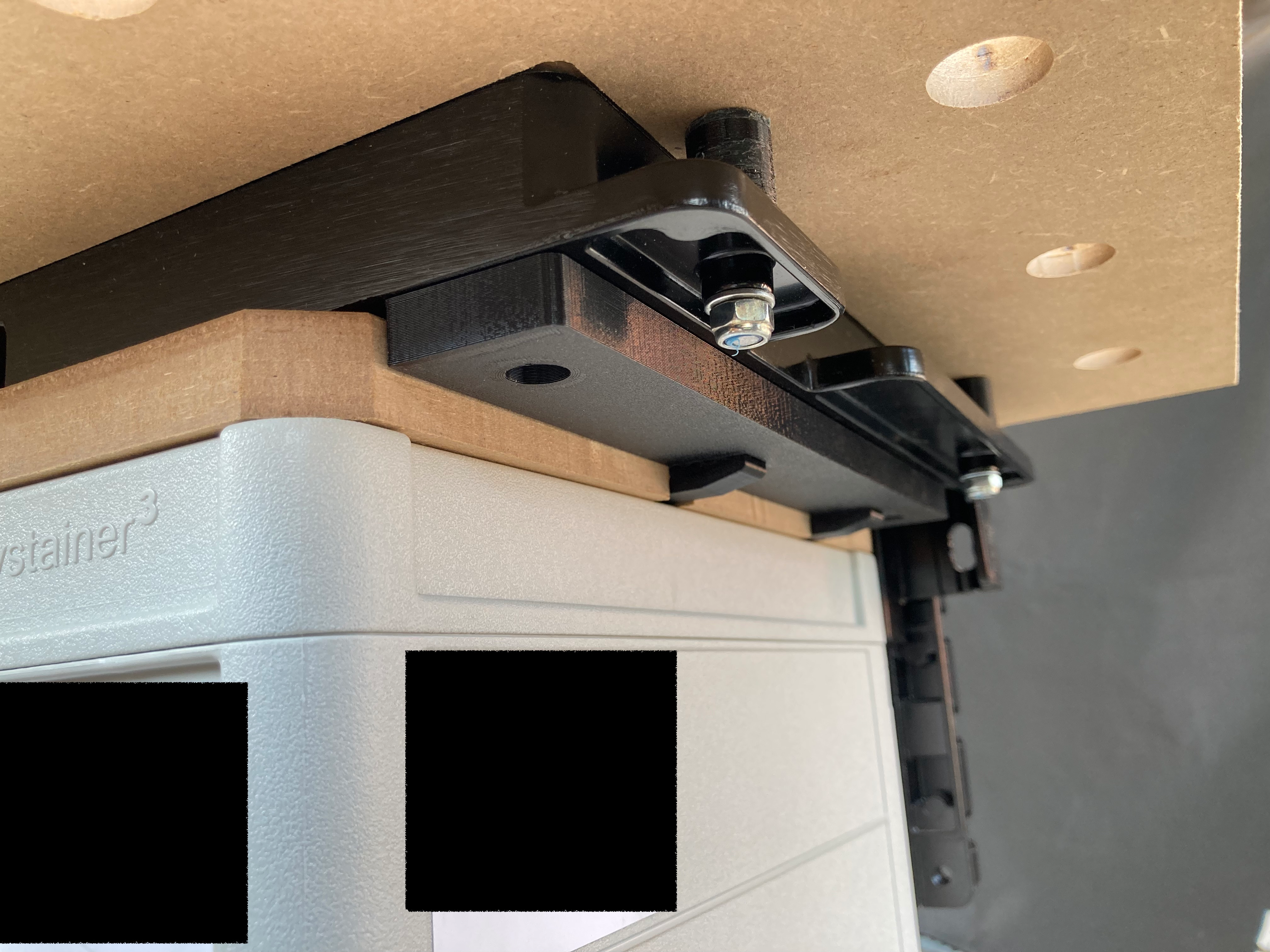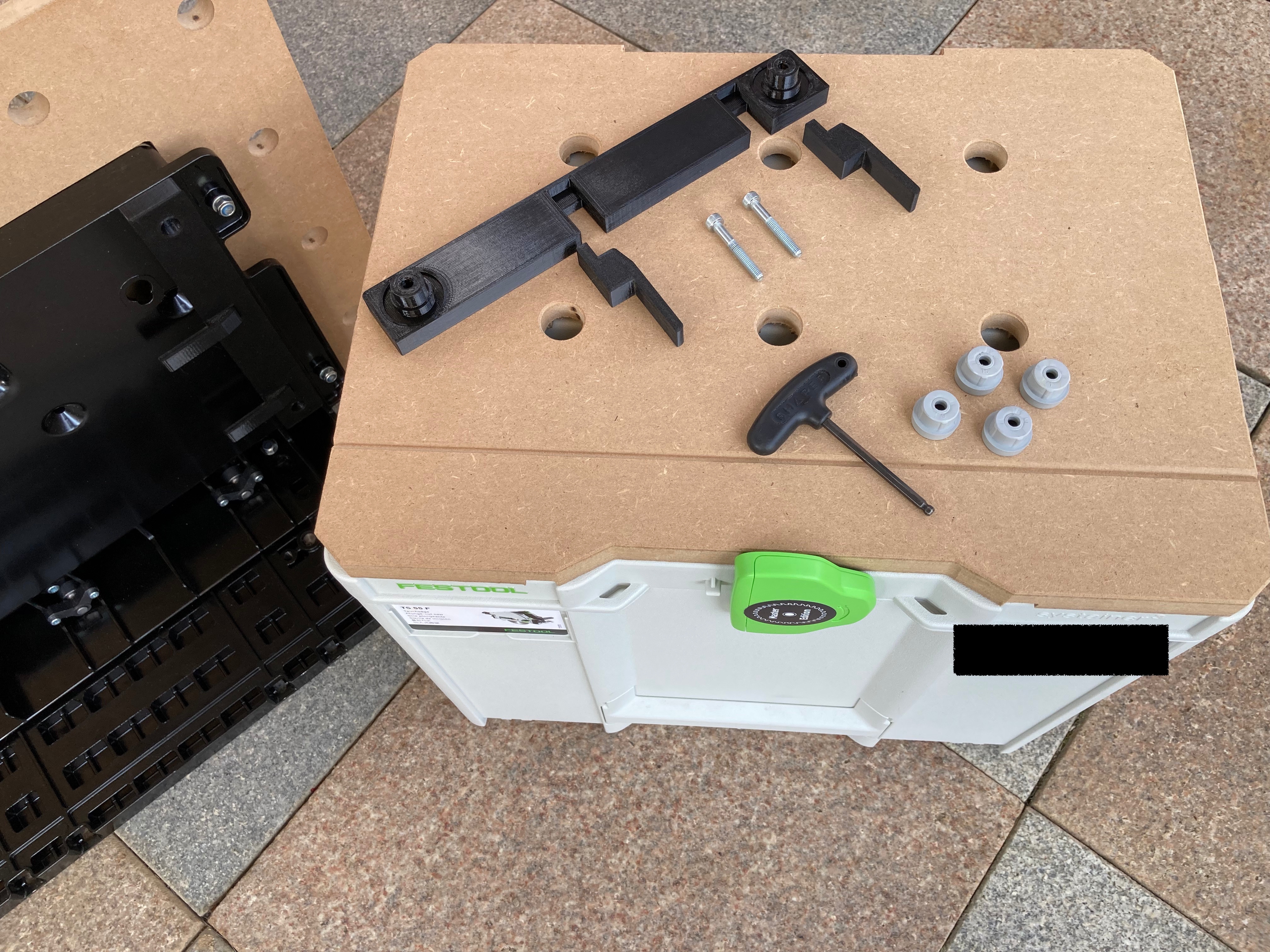 The T-Loc Systainer can also be used as a mobile workbench. Based on the following designs*), two special brackets for the Shaper Origin workstation were designed to fix them on the MDF board. The original rubber feet of the workstation can be removed with the allen key supplied with the Shaper Origin or Workstation and the brackets can be screwed in with a precise fit. The brackets are designed in several parts so that relatively quick assembly/disassembly is possible.