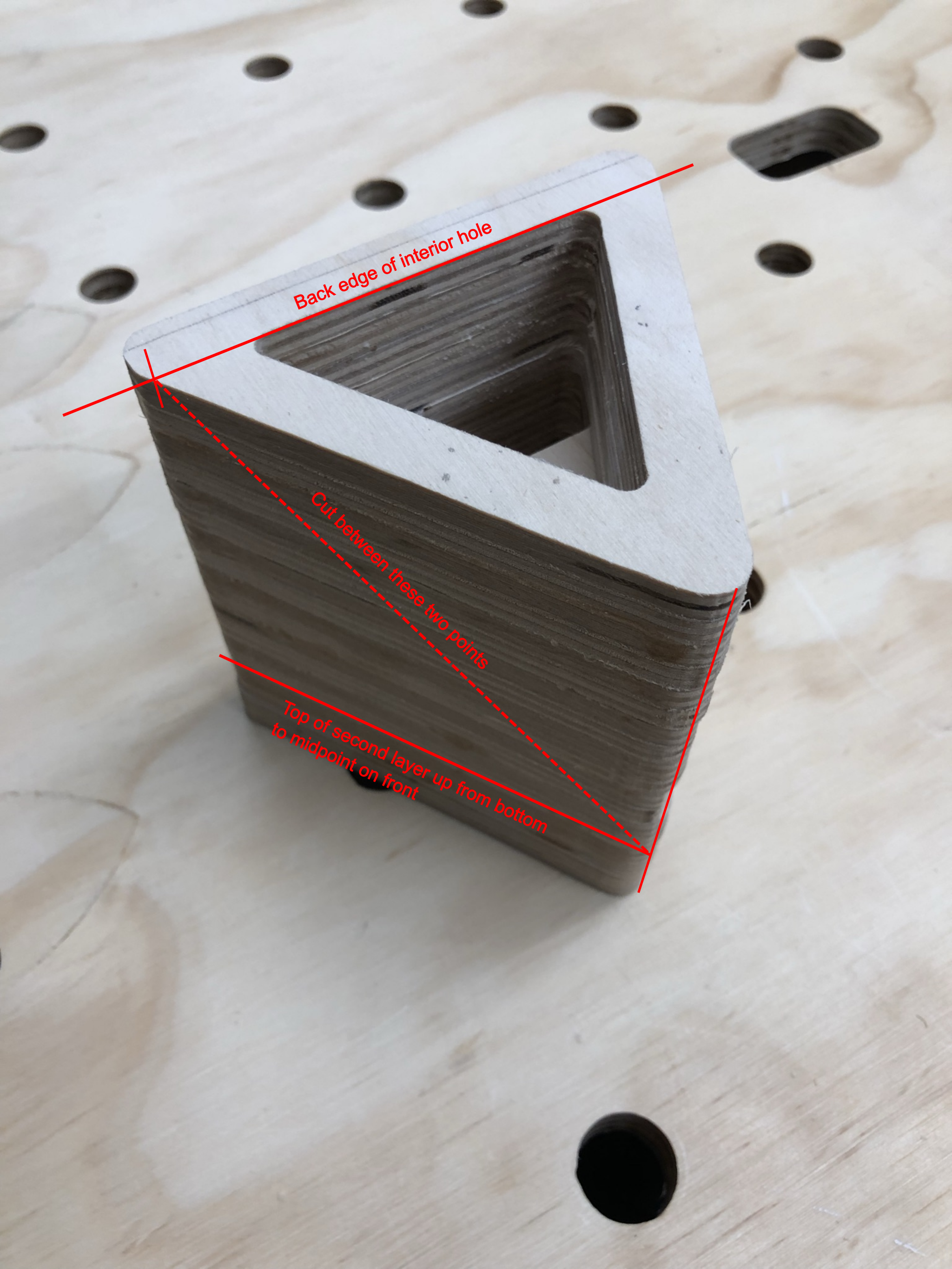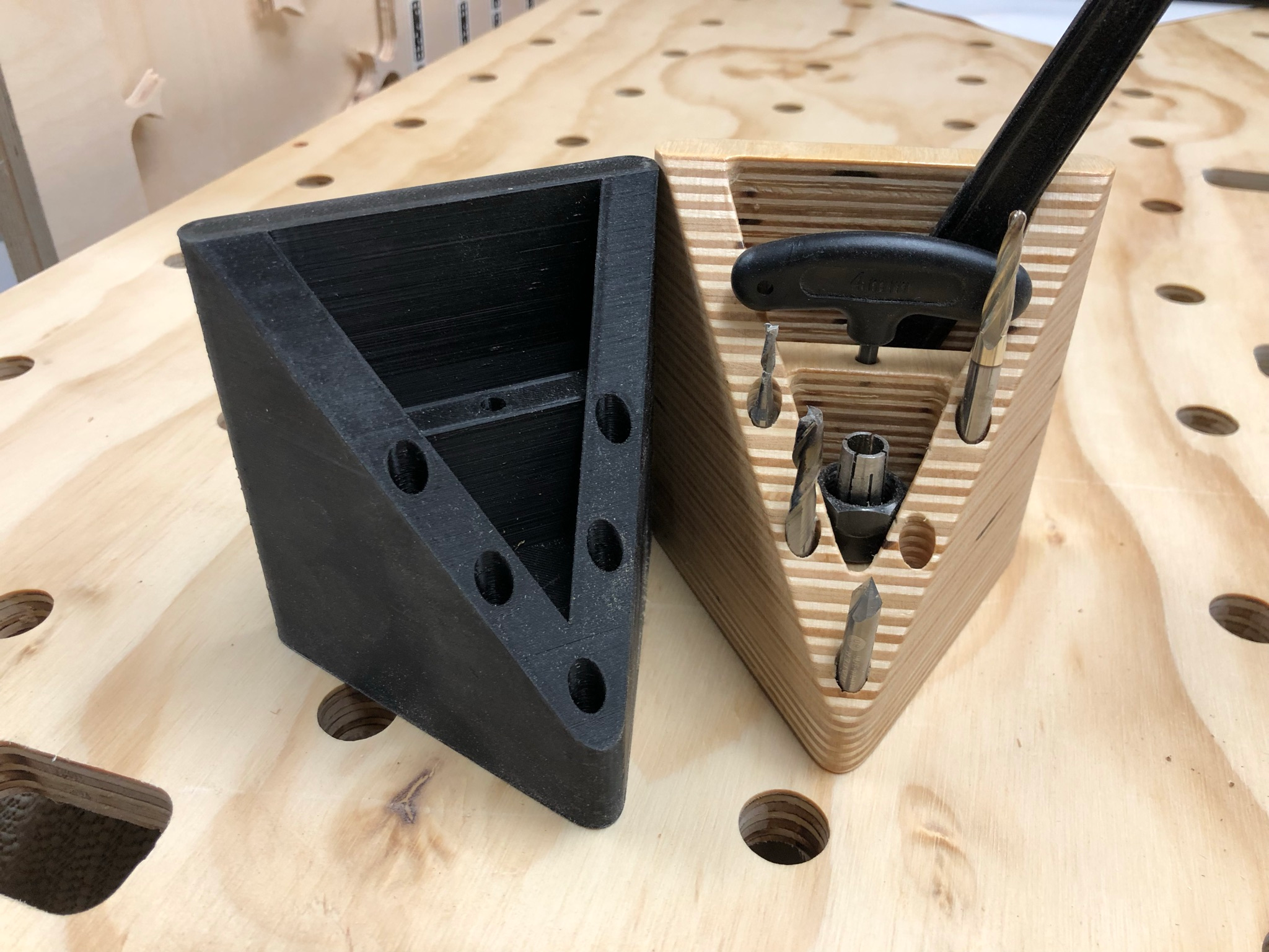 1. Lay out a tape field on a large sheet of plywood. Determine roughly where the pieces will be cut out of and secure that area to a spoil board with double stick tape. Import and place the template. 2. Start with the 1/8" bit and helix cut the small holes for the hex key with a 0 offset 3. Switch to the 1/4" bit and helix the holes for the bits with a 0 offset 4. Cut the interior holes and exteriors of the parts with a .02" offset and 1/4" depth 5. Label the parts with a pencil; the parts are numbered with guides in the file with 1 being the top layer (skip labeling this one unless you want to sand it off) to 9 for the bottom 6. Continue cutting the interior holes all the way through the material and make a final pass with 0 offset 7. Cut the exteriors all the way around with the .02" offset and down to 3/8" 8. Make the final through-cut with a tab left on the back side of each piece; this is indicated with guides on layer #1, but you need to do this on all of the pieces to keep them secured. I tried using plenty of double stick tape but couldn't get it to stick well enough to hold the pieces. 9. Make a final finish pass with 0 offset while preserving the tabs holding the pieces in 10. Free the pieces with a saw or other means 11. Clean up the tabs at the router table with a flush cut bit 12. Sand the pieces to remove extra fuzz that will interfere with gluing and sand the interior holes since they are less accessible after assembly 13. Glue up with a sparing use of CA glue and clamp (it doesn't take much to hold the parts together and I didn't want any squeeze out into the holes) 14. Sand the exterior smooth with a belt sander 15. Cut the angled top on the bandsaw (or tablesaw, possibly). You're looking to cut a line connecting the front of the second layer up to the back edge of the interior hole. See pictures. This angle is approx. 42 degrees and I cut it upside down using my bandsaw with the fence set to the distance for the top edge 16. Do additional sanding and apply a few coats of shellac Settings for 3D printing (based on the "Standard Quality" Cura profile but some tweaks to increase strength): - Material: PLA - Layer height: .2mm - Wall width: .4mm - Wall count: 5 - Top and bottom layer count: 6 - Fill gaps between walls: Everywhere - Z Seam Alignment: Random - Infill: 10% - Infill pattern: lines No supports or extra adhesion needed. It took about 15 hours to print.