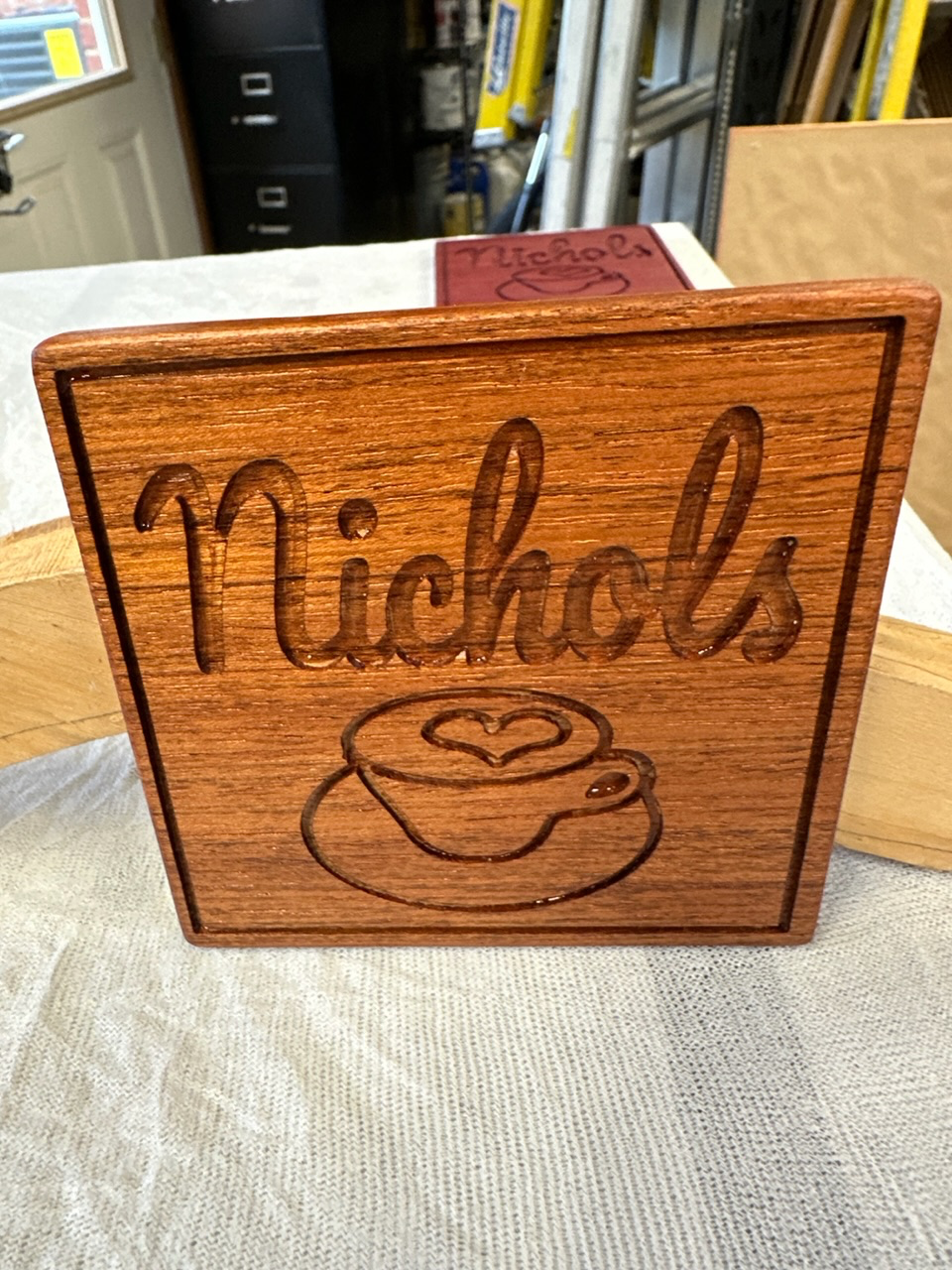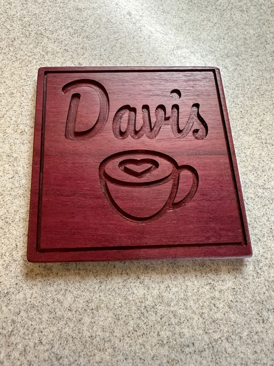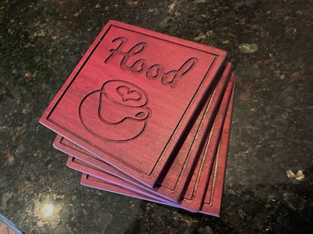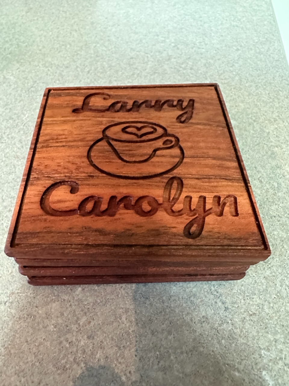 These svg files were created in Shaper Studio. The artwork and the fonts used are all included in Studio. When choosing a font to use with a 1/16th bit in Studio, it is helpful to select "Plan View" and set the bit width to 1/16th or 0.0625 and see if the font selected will work with your chosen bit. If not, you need to either choose a different bit or a different font. Sometimes, I find it very helpful to use a slight negative offset on some fonts. The outer square is only included in the SVG file for alignment purposes. Once the grid is created with the anchor point set at lower left and position set to 0,0, it is easy to place the design in the correct place. So far, I have created around 10 sets of 4 to give for Christmas or housewarming presents. My coasters have been rubbed with Oddie's Oil for the finish.
