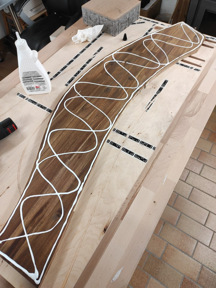Wenn ihr Material und Werkzeuge soweit parat gelegt habt, kann es losgehen! Die Umsetzung des gesamten Projektes hatte einen Umfang von ca. 30h. Also etwas Zeit einplanen... Die Formgebung wird maßgeblich durch die Seitenteile bestimmt. Diese wurden am PC so gestaltet, dass sie problemlos auf einer Leimholzplatte Akazie (siehe Materialliste) Platz finden können. Zuerst wurde die Leimholzplatte mit ausreichend Shaper Tape im Abstand von ca. 100mm beklebt. Jetzt kommt auch schon die Shaper das erste Mal zum Einsatz, denn die Oberfläche muss eingescannt werden. Nachdem ein entsprechender Workspace erstellt wurde, muss die für den Ausschnitt vorbereitete SVG- Datei passen platziert werden. Dazu empfiehlt es sich ein Raster auf dem Workspace zu generieren. Den Ankerpunkt dann im Ursprung des Koordinatenrasters (also unten links, auf X0mm, Y0mm) setzen und nun den Ausschnitt dort platzieren. Weiter geht es mit dem Einspannen eines 6mm Holzfräsers (Einschneider mit im Lieferumfang der Shaper). Dann wie gewohnt einen Z-Touch um die Werkzeuglänge zu referenzieren. Los geht das Shapern! Eingestellt auf eine Drehzahl von 2500 1/min und einer schrittweisen Tiefenzustellung von 5mm müssen nun die beiden Teile aus dem Material gearbeitet werden. Diese Prozedur erfolgte in meinem Fall mit 18mm starken Akazienholz ganze vier Mal! Je Platte sind ca. 45min Bearbeitungszeit einzuplanen. Nachdem von jedem Teil jeweils 2 Exemplare vorhanden sind, können sie aufeinander geleimt werden, damit sie eine Endstärke von 36mm erreichen. Ich habe mir à la MacGyver mit ein paar Pflastersteinen zum beschweren und einer weiteren Holzplatte beholfen um einen möglichst gleichmäßigen Anpressdruck zu erzeugen. Das Ganze habe ich anschließend über Nacht abbinden lassen, sodass eine feste Verbindung entsteht. Ran an die Nachbearbeitung! Zuerst alles überschüssige Material, Leimreste etc. mit 40er Schleifpapier entfernen, danach mit 80er solange nacharbeiten, bis eine gleichmäßige glatte Werkstückkante entsteht. Die Oberfläche des vorgeölten Leimholzes war mir persönlich zu dunkel. Deshalb entschied ich mich die gesamte Oberfläche mit einem Elektro- Schwingschleifer abzuschleifen, damit das Leinöl später besser einziehen kann und der originale Farbton des Holzes besser zum Vorschein kommen kann. Aus Zwei mach Eins! Beide Teile müssen nun zu einem stabil verbunden werden. Schreiner kennen hier möglicherweise viele Verbindungstechniken. Eine sehr einfache, stabile und trotzdem schnelle Verbindung ist, mit Rundholzzapfen zu arbeiten. Für jedes Seitenelement habe ich jeweils drei mit einem Durchmesser von 15mm und einer Länge von 140mm angefertigt. Nun müssen am Stoß beider Teile völlig identische Bohrungen erstellt werden, die exakt senkrecht aufeinander stehen. Tun sie dies nicht, wird die Verbindung sehr schief und unschön aussehen- also hier wirklich sehr exakt arbeiten. Tipp: Mit Reißzwecken kann man einen Abdruck auf die gegenüberliegende Seite super übertragen.. oder man nutzt die Shaper ;) Nun können die Zapfen eingeleimt und mit einem Hammer vorsichtig in die Löcher eingesetzt werden. Beim Zusammestecken beider Teile ist eine zweite Person sehr hilfreich. Nach dem abbinden des Leims, sollten alle Übergänge nochmals gründlich abgeschliffen werden. Platte No. 5 Die verbleibende Holzplatte muss nun längs in vier gleich breite Bretter gesägt werden. Diese Bilden nach entsprechendem Schleifen die Querverbindungen und dienen der Stabilität. Befestigt werden sie an den bereits eingefrästen Löchern mit 4x80er Spax. Das Grundgerüst steht! Nun können die Parallelogrammleisten auf Länge geschnitten werden. Ich habe diese aus dem Fachmarkt in 3m Länge bezogen und anschließend halbiert. Danach die Kanten sorgfältig abgeschliffen und eine Leiste als Schablone mit passend diagonal zueinander stehenden Löchern ausmessen. Anschließend müssen alle Löcher an den 31 Leisten markiert werden. Lattung vornehmen. Die erste ist entscheidend für eine gleichmäßige Auflattung. Damit die Abstände der Zwischenräume gleichmäßig bleibt, habe ich zwei Abstandshalter in Form eines Winkels mit einer Stärke von 11mm hergestellt. Das ist wirklich sehr hilfreich und erspart eine MENGE Ärger ;). Zwischen die Latten und die Auflagefläche kommen kleine runde Kunststoff- Abstandshalter. Sie sorgen dafür, das später genug Luft unter die Latten kommt und Feuchtigkeit keine Chance hat. Jetzt wird´s glitschig Damit das Holz gegen eindringen von Feuchtigkeit und UV- Strahlung sowie sonstiger Witterungsbedingung (kosmische Strahlung, radioaktiver Fallout.. man kann ja nie wissen) geschützt ist, kann Leinöl weiterhelfen. Es ist absolut biologisch und vollkommen unbedenklich. Das Ganze kann mit einem Pinsel großzügig aufgetragen werden und anschließend einziehen. Leinöl versiegelt die Poren des Holzes und wirkt außerdem wasserabweisend. Gartenmöbel können damit jährlich nachbehandelt werden. Wer jetzt noch Bock hat kann... einen tollen Schriftzug anbringen, damit das Unikat perfekt ist ;) Ich entschied mich für den Schriftzug "Relax".. denn das ist schließlich genau die Aufgabe dieses Waldsofas. Ich habe es mal als File angehängt. Ihr könnt natürlich machen worauf ihr Lust habt. Ausgeschnitten habe ich es mit dem beiliegenden 3mm Einschneider und 2000 1/min aus Birke Multiplex 12mm und anschließend mit Acryl Buntlack weis angestrichen. Das war es soweit! Also ran ans Werk und anschließend das Relaxen nicht vergessen ;) Beste Grüße Sebastian