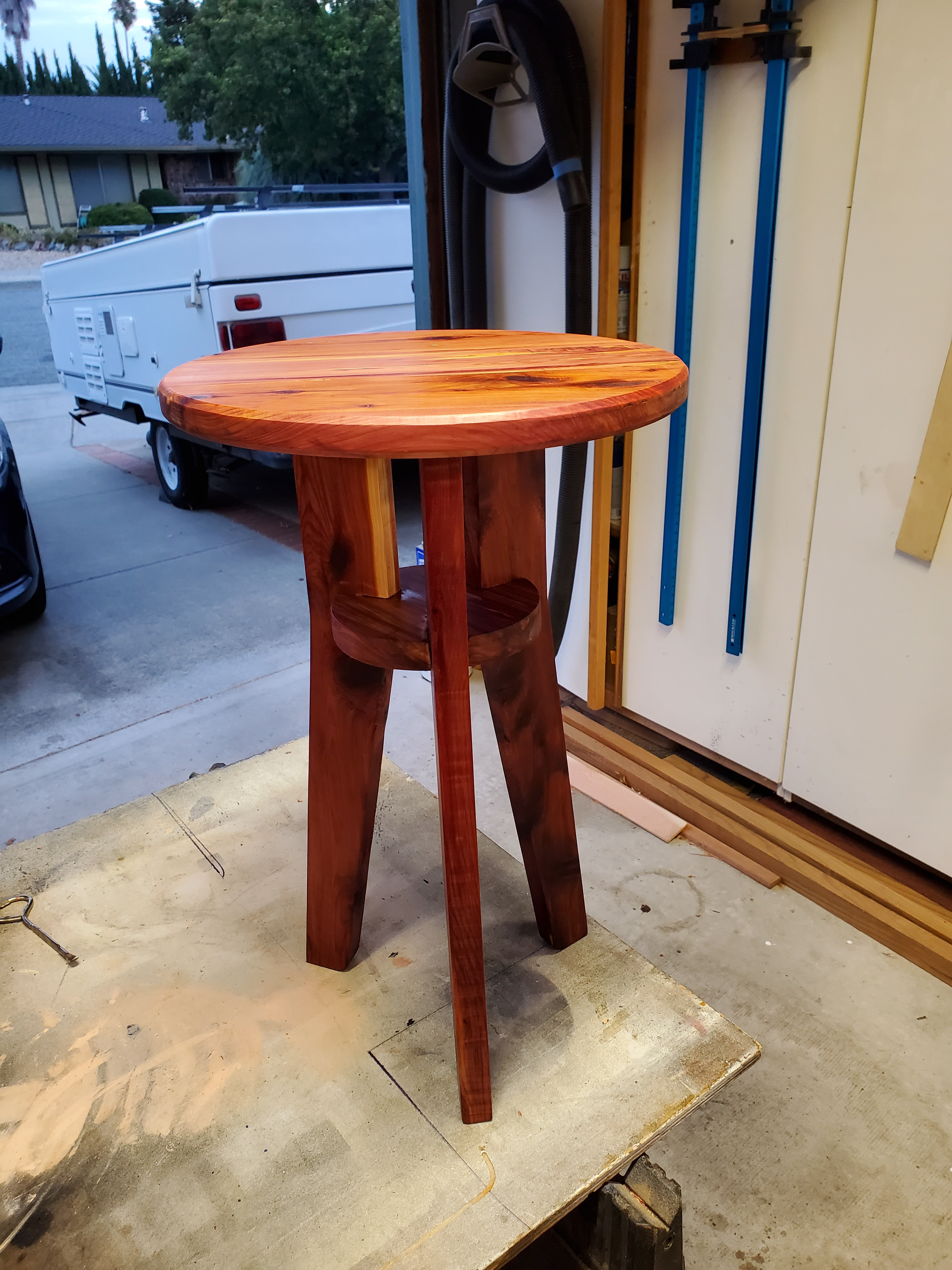 I found some nice aromatic cedar and decided to make a small table/plant stand. Small shelf is 6 inches round and notches are at every 120 degrees. Legs are 18” long Top is about 12 inches round, designed on tool attached with figure 8 attachments and screws. Feel free to add through tenons if desired. Plans are for ¾ inch material. Finish is Danish oil.