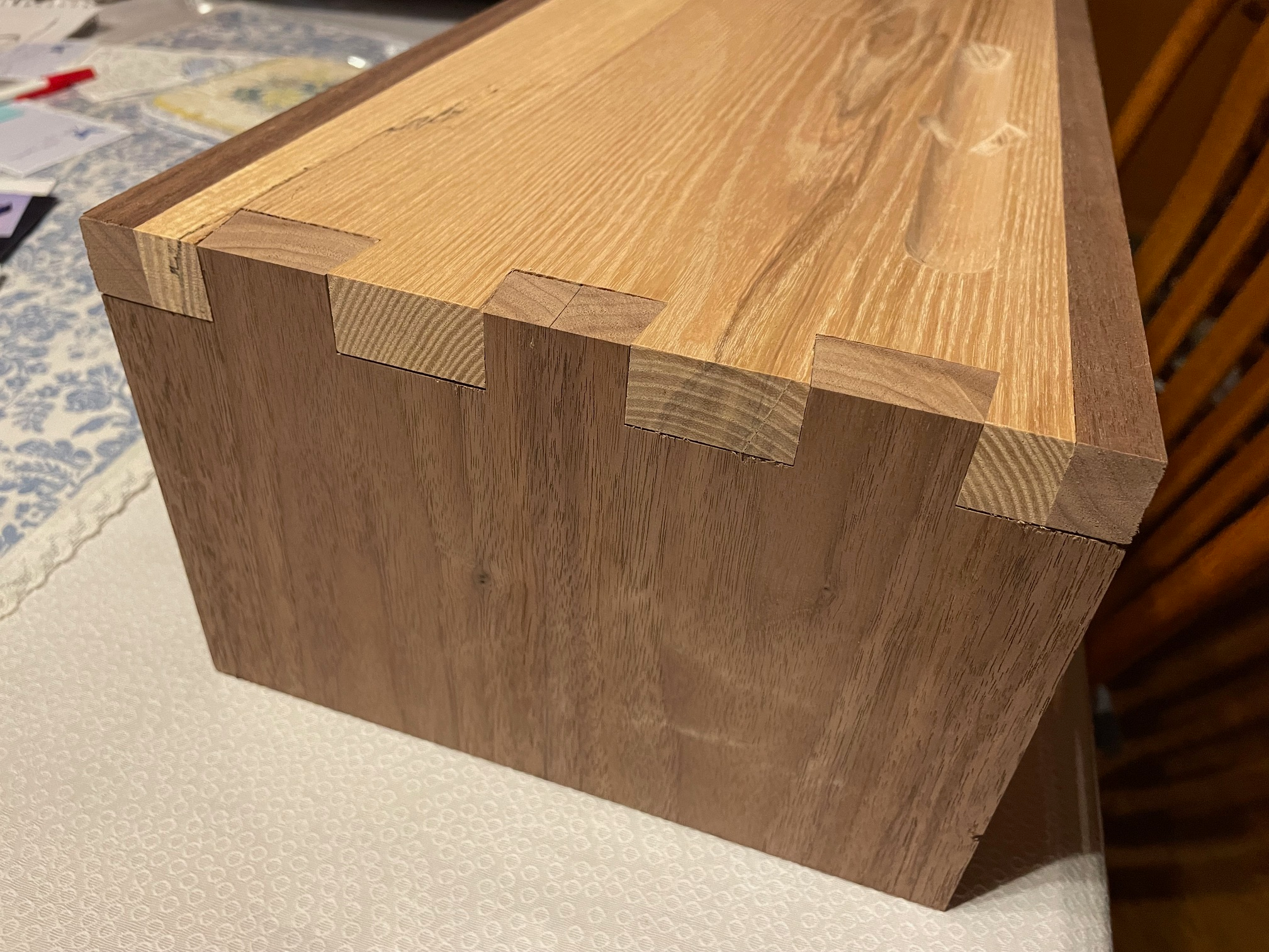 This is the first project I ever mad with the Shaper Origin. I used the very excellent site dovetails.bieber.dev to design the dovetails. I included a .png file of the image on the site in case it helps anyone who wants to use the site to design dovetails. It took me a few tries to understand how to use the .svg files in order to create dovetails that fit right, so I wrote up some notes to myself for the next time in hopes it will make it easier to remember the steps. I have included those notes in the project files in case it will help anyone else. I recommend making the dovetails from scraps the first time, until you get the hang of it. Be sure to use scrap that is the same dimensions as your expensive wood, so they will correctly prepare you for any adjustments you need to make so they fit right.