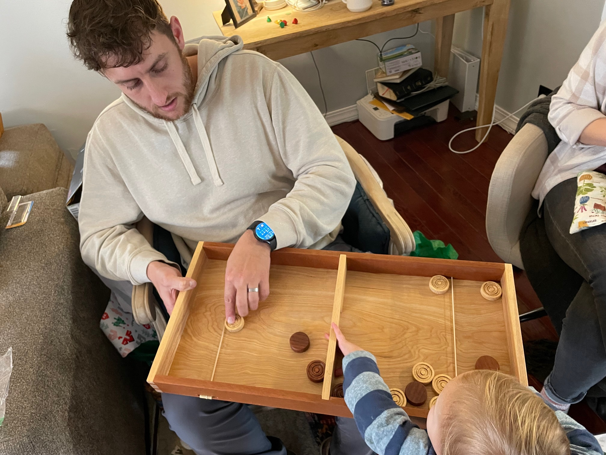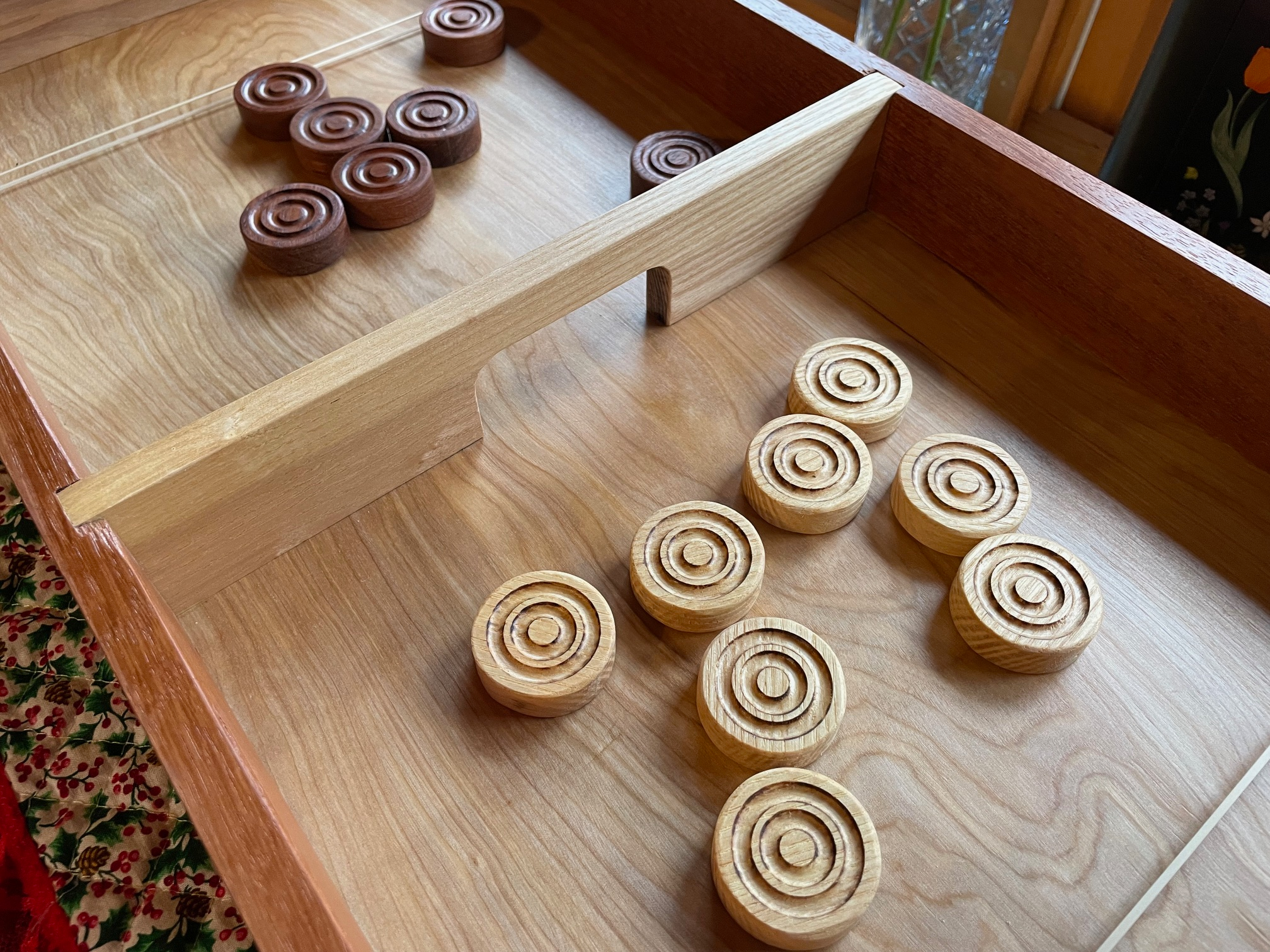 I used traditional woodworking for much of this project, but used the Shaper for: - Dovetail corners at each of the four corners - round play pieces - center curved square between the two sides - recessed place to hold the dowels which hold the rubber bands I am not going to explain step by step everything, but here is the rough overview: 1) Cut the side rails and center rail to length. I cut them to make the final project 16" x 24". 2) Cut the tails for the dovetails 3) Cut the pins for the dovetails, 4) Cut the recessed place to hold the dowels and rubber bands 5) drill the holes for the rubber bands to go through 6) Use a router table to route a 1/4" rabbet around the entire inside edge to hold the bottom piece of plywood 7) Sand to 220 grit all the rails and bottom plywood piece. 8) Apply a clear coat of finish. (Use masking tape to cover all the surfaces in the dovetailed joints that will need glue. Also tape the edges of the plywood bottom) 9) When dry, lightly sand to 220 grid, and apply another coat of finish. 8) Take off the masking tape, apply glue to the dovetail joints, and the center rail, and assemble them. Wipe off the squeeze-out. Make sure everything is square. clamp as necessary. 9) When the glue is dry, glue the bottom on. Wipe off the squeeze-out 10) Lightly sand to 320 grit, and apply another coat. When dry, buff with butcher paper and buffing pad to desired sheen 11) Use the Shaper with a 1/8" bit to make the circles in the middle of the play pieces. Once they are all done, use the Shaper to cut out all the play pieces. Lightly sand and spray with clear finish, sanding between coats. 12) to put the rubber bands in their places, I used a piece of coat hanger to make a hook at one end, and a handle at the other. Hold the dowel and rubber band in their place on one side, then feed the rubber band through the hole. Feed the coat hanger through the hole on the opposite side, and snag the rubber band. Then pull the rubber band through the hole on the opposite side, and use insert the dowel through the rubber band to hold it in place.