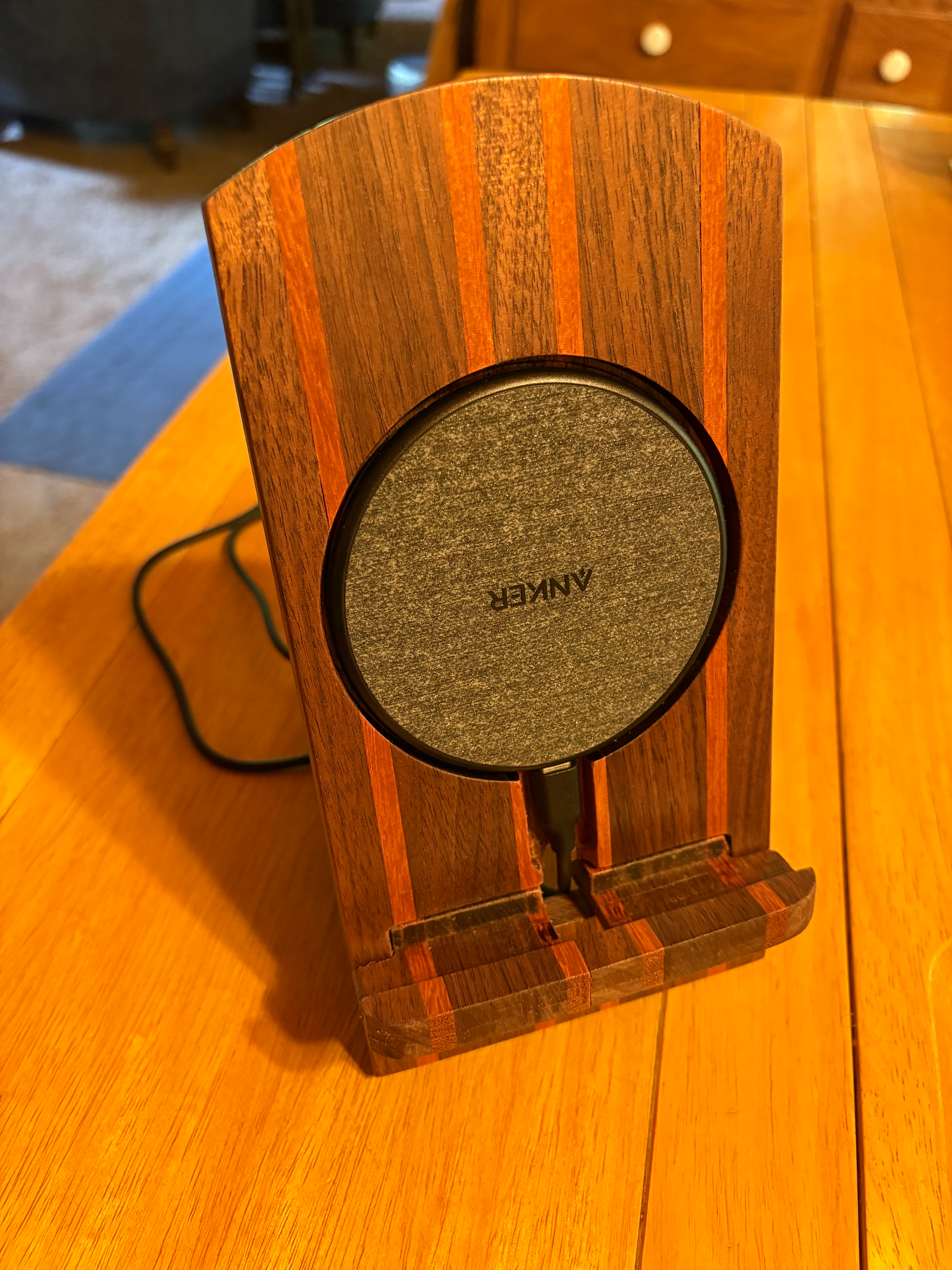 The cell phone charging pad was made by Anker, available at Walmart. I used a spray-on poly for the finish.