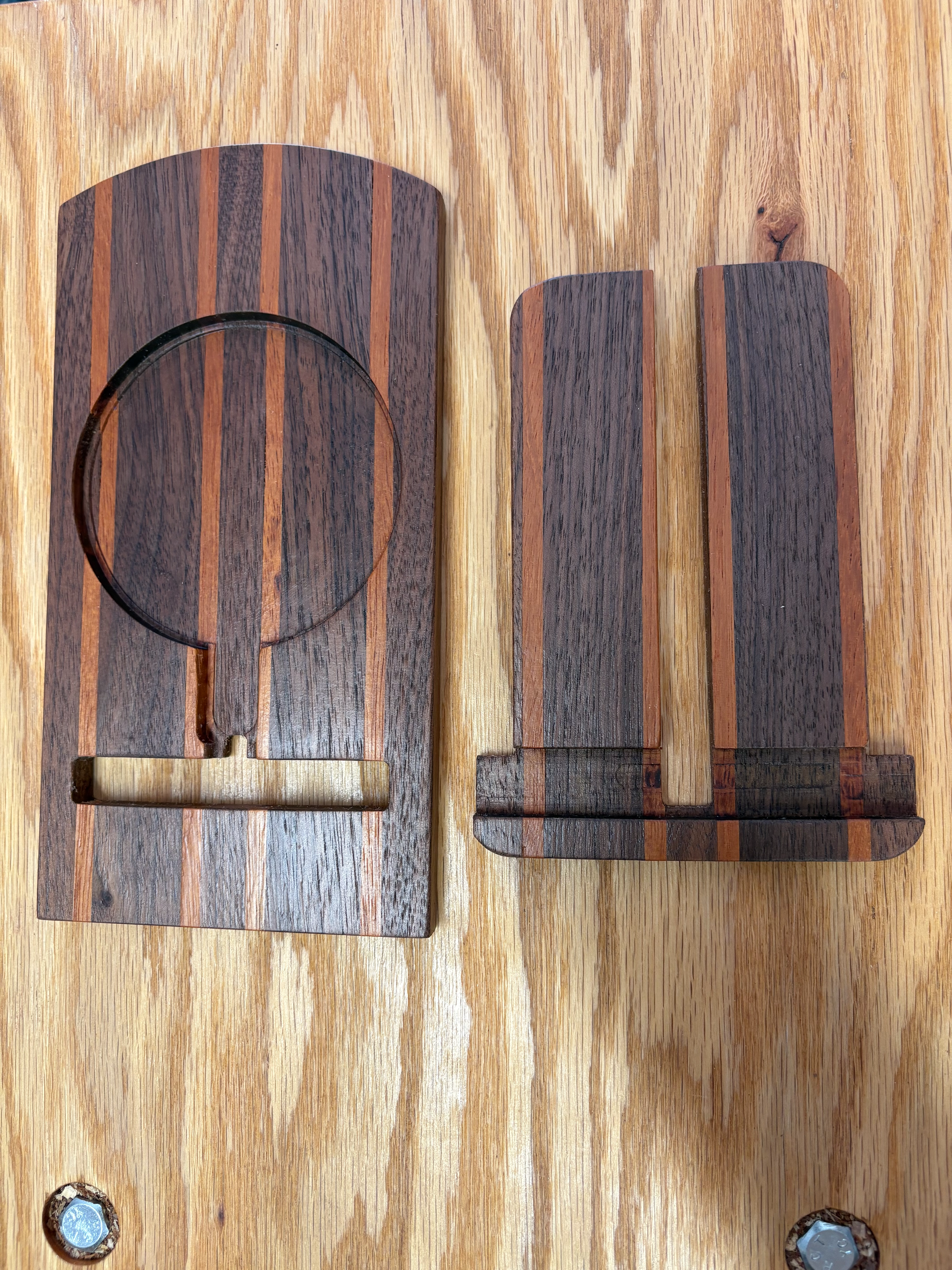 I glued up scraps of Walnut and Brazillian cherry to make the final dimension for the two boards described in the materials. I cut the shapes according to the cut pattern. Once I had the hole cut for the charging pad, I fit it for the pad and found it too small, and enlarged it slightly to make a better fit. Aside from that it was a simple matter of cutting, sanding, and finishing. I sanded it, then I gave it two coats of a spray-on poly, then sanded it with 220 grit again, then gave it one more coat of poly.