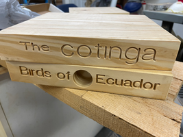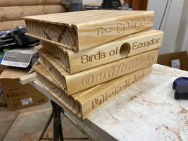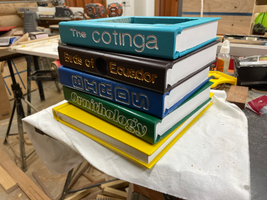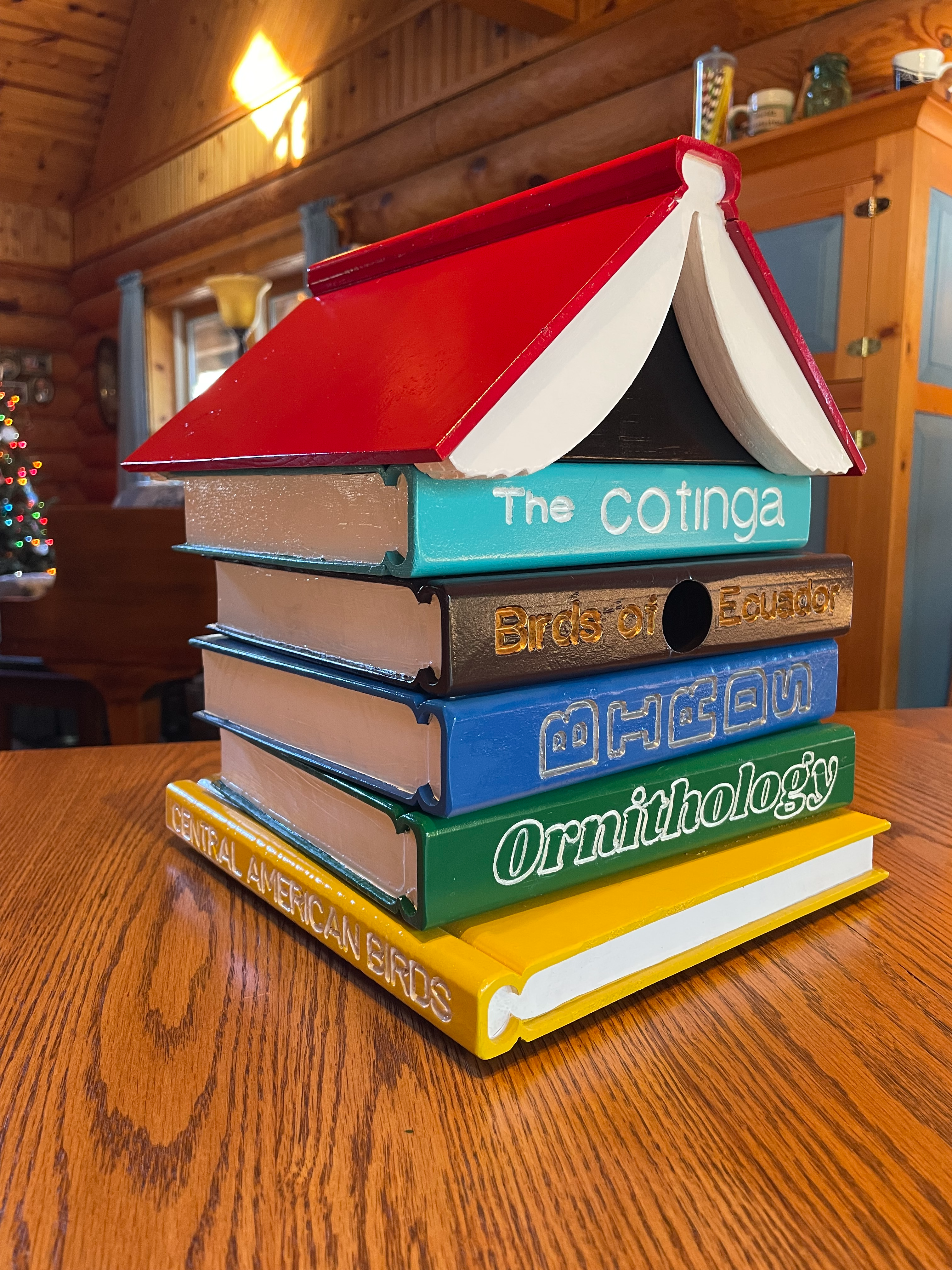 This is a bird house made from a stack of wooden blocks. Each block of wood has been shaped to have the book title along the "spine", and the rest of the edges shaped to look like the other three sides of the book. It is named after The Cotinga Foundation, a non-profit that trains special-needs teachers in developing countries. My sister started the Foundation, and I made the birdhouse as a retirement present for her.