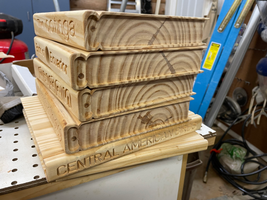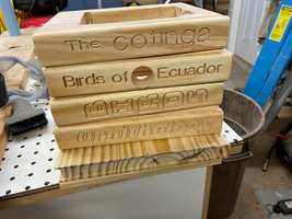 It would be very hard to provide step by step instructions for this project. Each "book" is a separate block of wood. The very bottom one is 3/4" pine, and the others are 1 1/2" pine. The .svg files will show you how I created the profile on the sides of the "books" so they look like a book binding, and the bound edge of the books where the lettering is. After I had routed the side profile and lettering, I ran the bound edge of the books through a router table with a round-over bit to give the bound edge a rounded over appearance. After I created the five books, I painted them all separately, including the lettering on the Titles. I used colored spray paint to paint each of the books. Then I used a small brush to fill in the letters with paint. Then to paint the part that was meant to be white paper, I taped off the inside edges of the book with masking tape, and painted the "paper" with a small brush. The yellow "book" was intentionally bigger than the others and became the bottom of the bird house. On each of the "books" that were to go above that, I cut a square shape in the middle of the book using a skill saw, to create the hollow spot for the bird house. I stacked the "books" intentionally crooked so they looked like an uneven stack of books. Once all the hollow spot were cut, I stacked the books, and connected them using glue and screws. The top most red book was made of two triangles (in black), with the white "pages" (cut with the Shaper) glued to the front of the triangles. Then the red covers of the book where glued to the sides the triangles, and the top piece (the "book binding" was glued on top. There were visible seams where the pieces on the book that made up the roof were glued together. To make those less noticable, I filled them with white caulk. Once everything was together, I gave it a couple coats of clear spray paint. This had the effect of making everything have the same amount of shine, and make a lot of the imperfections and corrections on the painted letters much less noticeable. It did not come out perfect, but I am still very happy with it. I have never made any other sort of project like it, and it was an interesting challenge to plan out and execute.